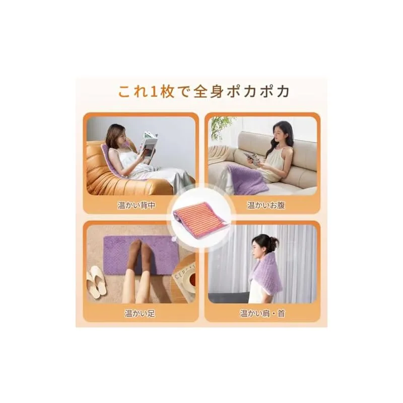 【用途広々&大判サイズ】40×76cmの大判サイズで、お腹・背中・首・肩・腰・脚など広い範囲をしっかりカバーできます。他社製品に多く見られる小型サイズと比べてゆったり使えるため、冷えやすい部分を効率よく温められるのが特長です。特にお腹まわりや腰などをやさしく温めることで、快適なリラックスタイムをサポート。冷え性対策にも活躍し、寒い季節に頼れるアイテムです。さらに、ご自宅のソファやベッドでの使用はもちろん、オフィスのデスクワーク中、学校での勉強時間、出張やアウトドアなど様々なシーンで活躍。持ち運びやすいサイズ感なので、場所を問わず幅広く使えます。年配の方からお子様まで家族全員で快適にご利用いただける、多用途で実用的なホットマットです。