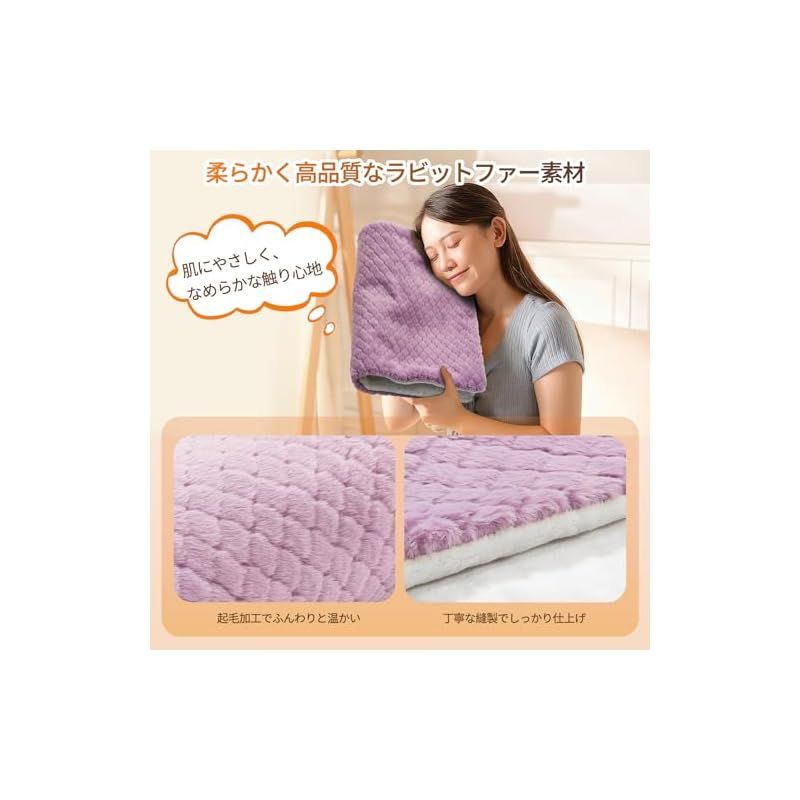 【快適なラビット調素材&贈り物にも最適】本製品は、外層に高級感あふれるラビット調素材、内層に高密度フランネルを組み合わせた二重構造を採用しています。一般的なホットマットは表面までフランネル素材で作られることが多い中、HUAYANはワンランク上のラビット調素材を外層に使用。ふんわり柔らかく、しっとり滑らかな肌触りは、まるで高級ブランケットに包まれているような贅沢な心地よさを実現します。さらに、ラビット調ならではの上品な光沢と高級感ある質感が、インテリアに置くだけで洗練された雰囲気を演出。長時間使用してもチクチクせず快適に過ごせるため、寒い季節の必需品として最適です。加えて毛玉や静電気の発生を抑える加工を施しており、美しい質感を長期間キープ可能。さらに、カラーはパープル・グレー・アイボリーの上品な3色展開で、落ち着いた雰囲気がインテリアにも自然に馴染みます。ご自宅用はもちろん、誕生日やクリスマスなど贈り物にもぴったりな、実用性と高級感を兼ね備えた防寒アイテムです。