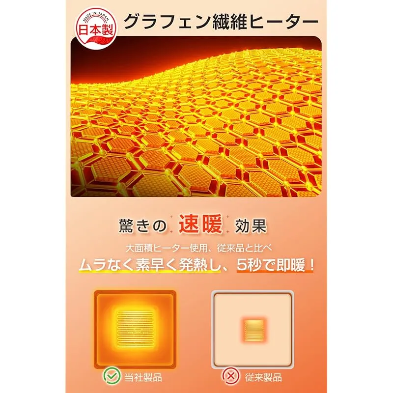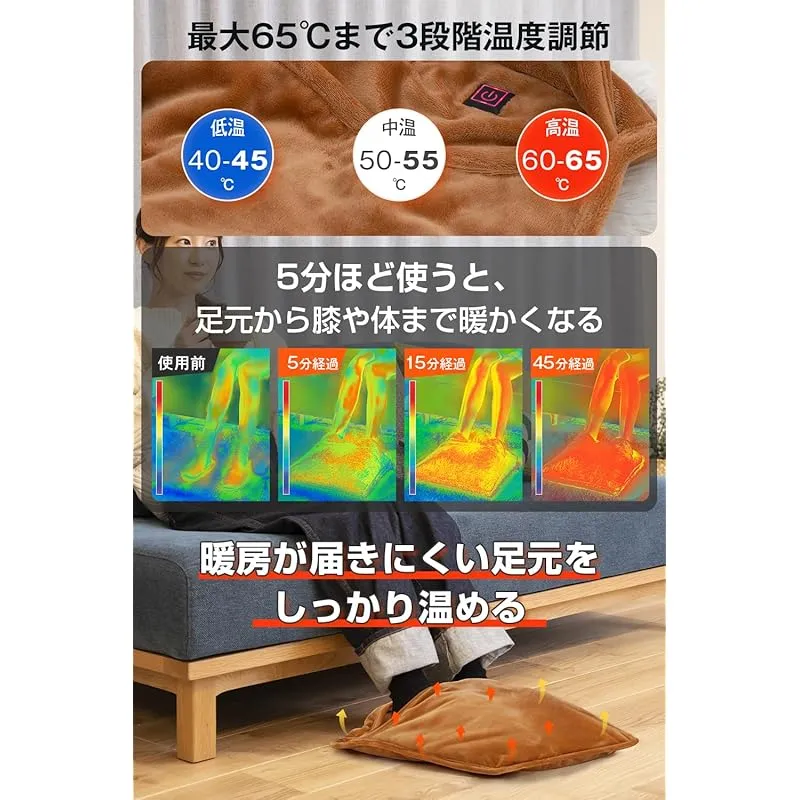 【 最大65℃極暖!冷える足元をポカポカに!!】当社の電気足温器は日本製高性能グラフェンヒーターを採用しており、速暖性・省エネ性・安全性が従来品よりはるかに優れています!電源入れて5秒で速暖、冬場の冷えやすい足元を底からじんわりと効率的に暖めます。 足温器を5分以上使うと膝や体までポカポカ暖かくなる!温度を高温(約60℃-65℃)・中温(約50℃-55℃)・低温(約40℃-45℃)の3段階で切り替えられます。寒い季節に快適な温かさをもたらす電気マット !