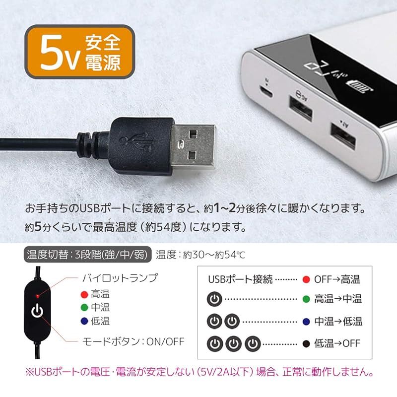 温度切替:3段階(強/中/弱) 温度:30-54℃ 電圧:5V USBケーブル長:120cm 洗濯可能(手洗いのみ/洗濯機・乾燥機使用不可)