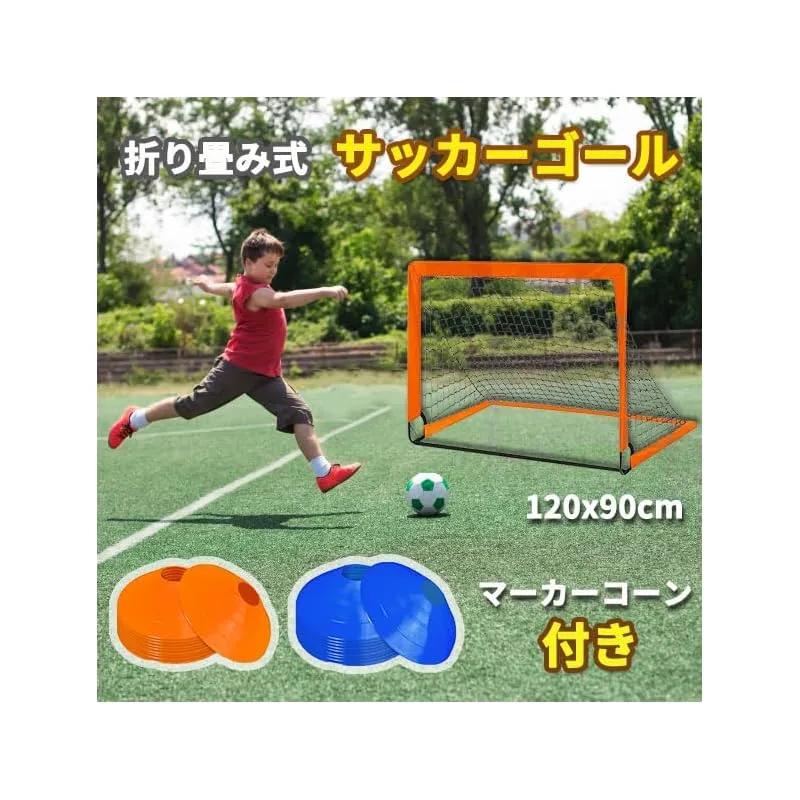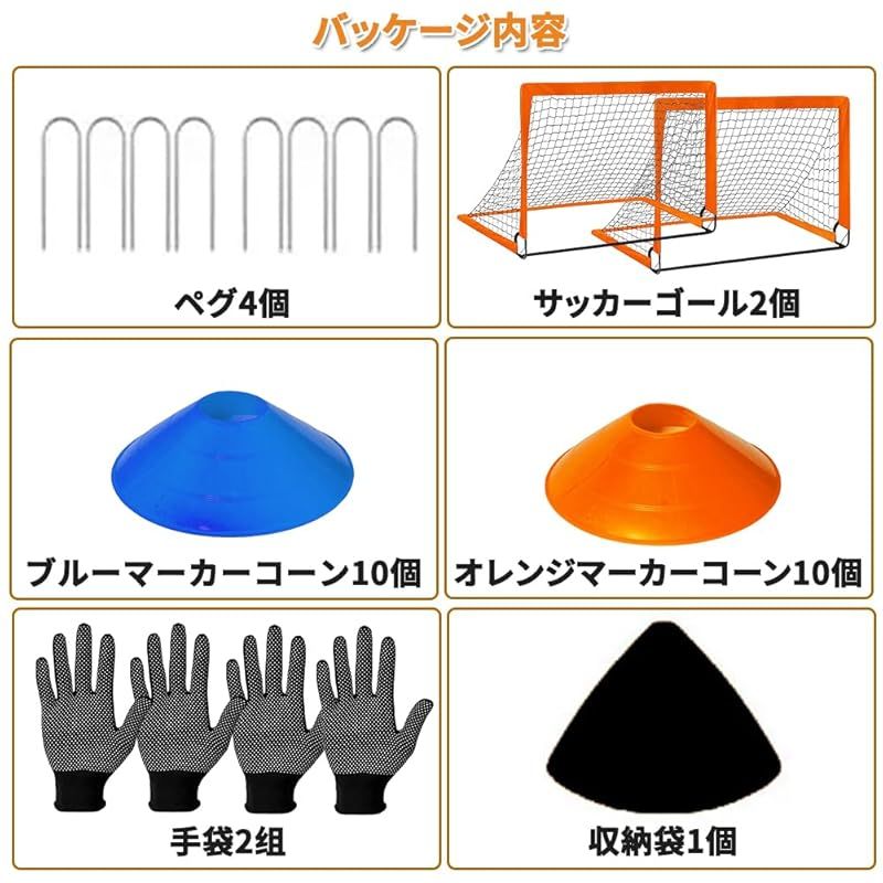 【商品詳細】サッカーゴールサイズ:120x90cm 重量(約): 1.5kg バッケージ:サッカーゴール1個、マーカーコーン10個(ブルー5個、オレンジ5個)、ペグ4個、収納袋1個、手袋1?