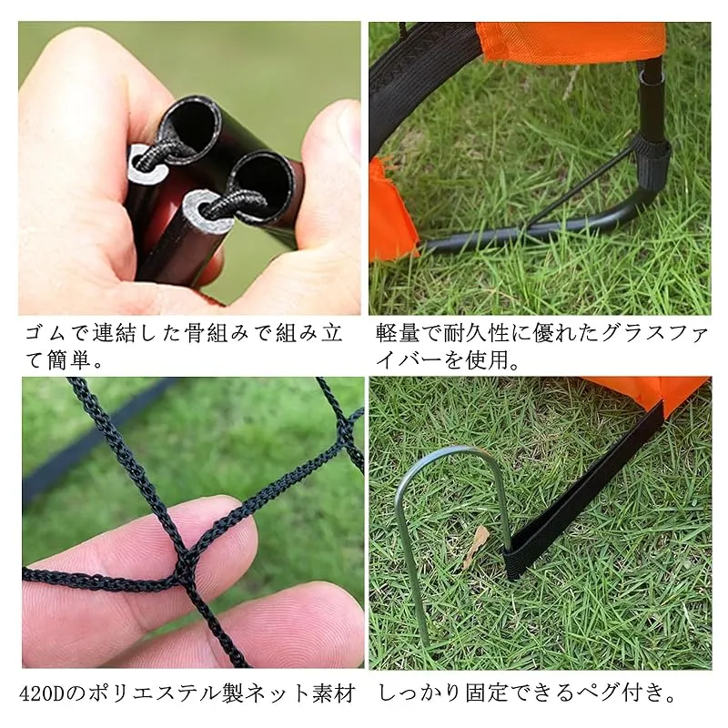 【丈夫な構造】耐久性に優れたグラスファイバーの骨組みと、高品質420Dのポリエステル製ネット素材を使用しています。付属のペグを使えば、強いシュートに対してもしっかりとゴールを固定でできます。