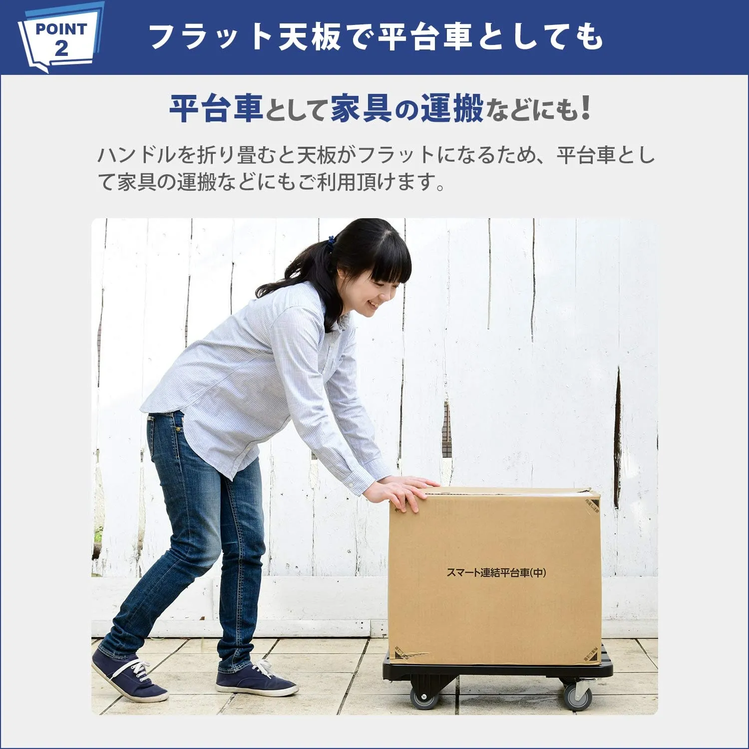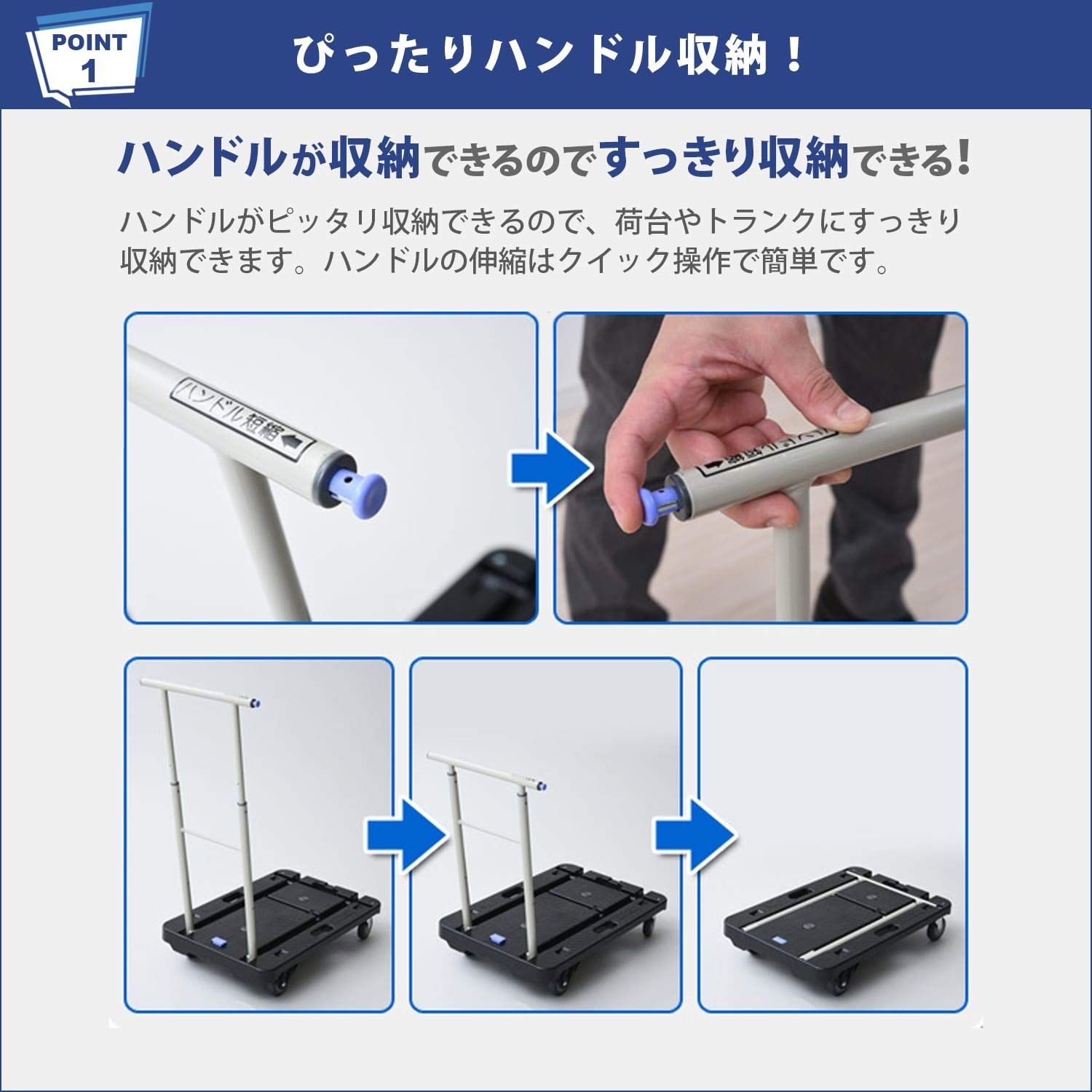 ●ハンドルがピッタリ収納できるので、平台車としても使用できる。