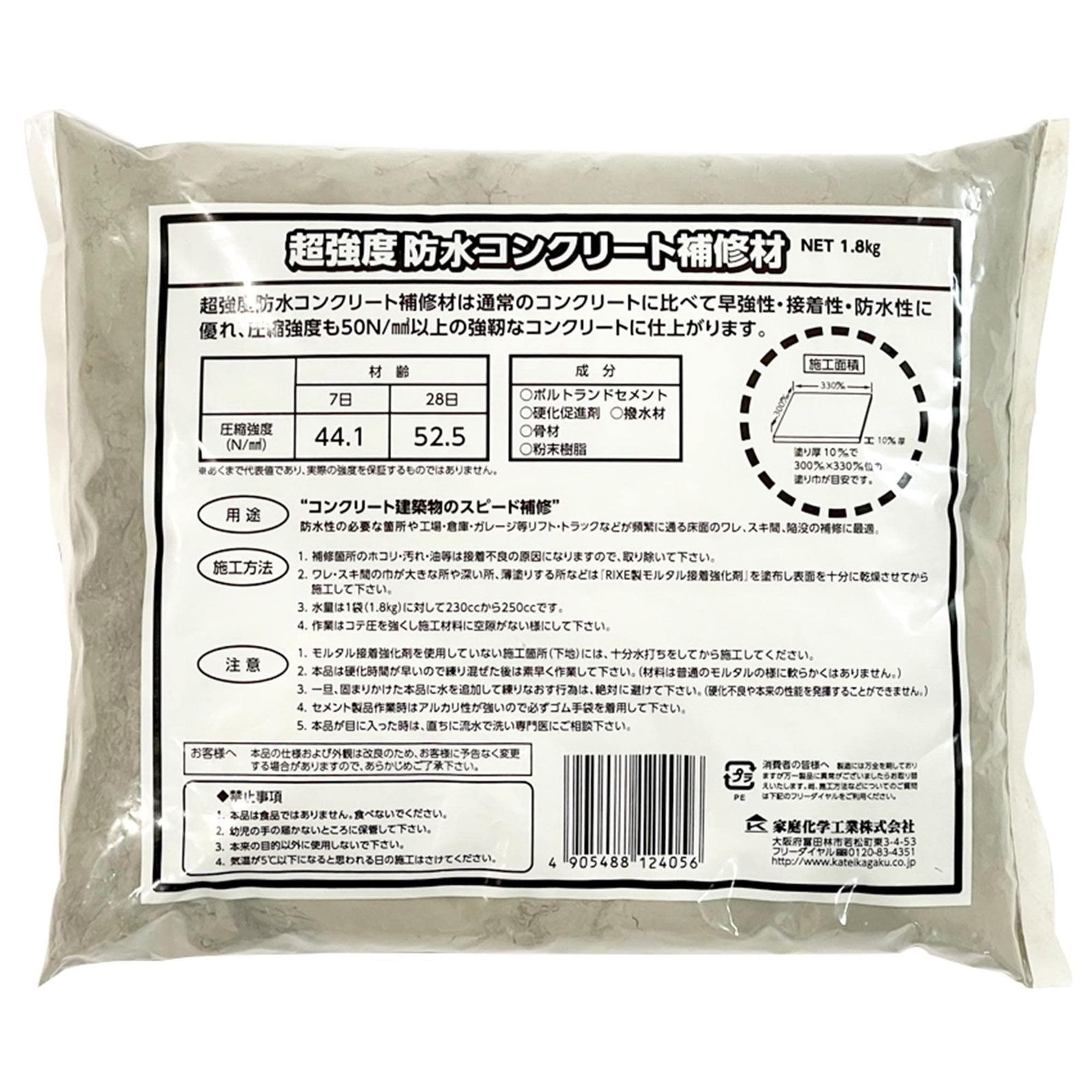 【特長】 防水性の必要な箇所やガレージの床面など強度の必要な部分の補修にご使用ください。 施工方法①施工箇所のホコリ・汚れ・油等は接着不良の原因になりますので、取り除いてください。②ワレ・すき間の巾が大きな所や深い所、薄塗りする所などは、「RIXE製モルタル接着強化剤」を塗布し表面を十分に乾燥させてから施工してください。(モルタル接着強化剤を使用しない箇所には十分な水打ちをして施工してください。③水量は1袋(1.8㎏)に対して230㏄から250㏄です。④作業はコテ圧を強くし施工材料に空隙がないようにしてください。