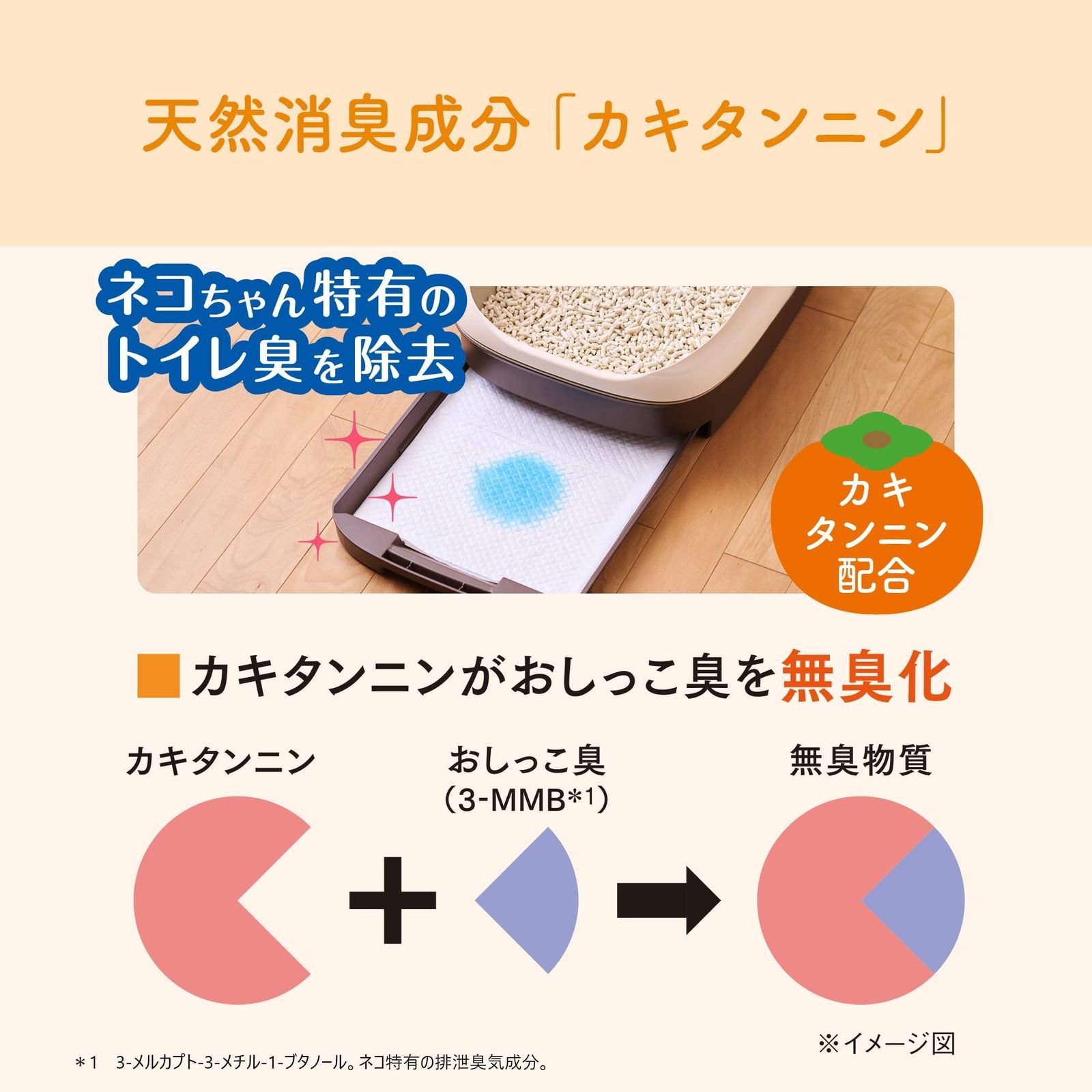 ●消臭成分「カキタンニン」配合でネコちゃん特有のトイレ臭を除去。ネコちゃんのおしっこ特有のニオイの原因と消臭成分「カキタンニン」が結合しネコちゃんのおしっこ臭を元から除去します。