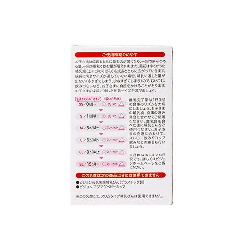●月齢や成長ごとに吸い穴の形や大きさを変えられるように、新生児専用のSSサイズから15ヵ月以上までの3Lサイズまでラインナップ。その時期に適切な飲み方ができ、適切な量が口に入っていくよう設計されています。
