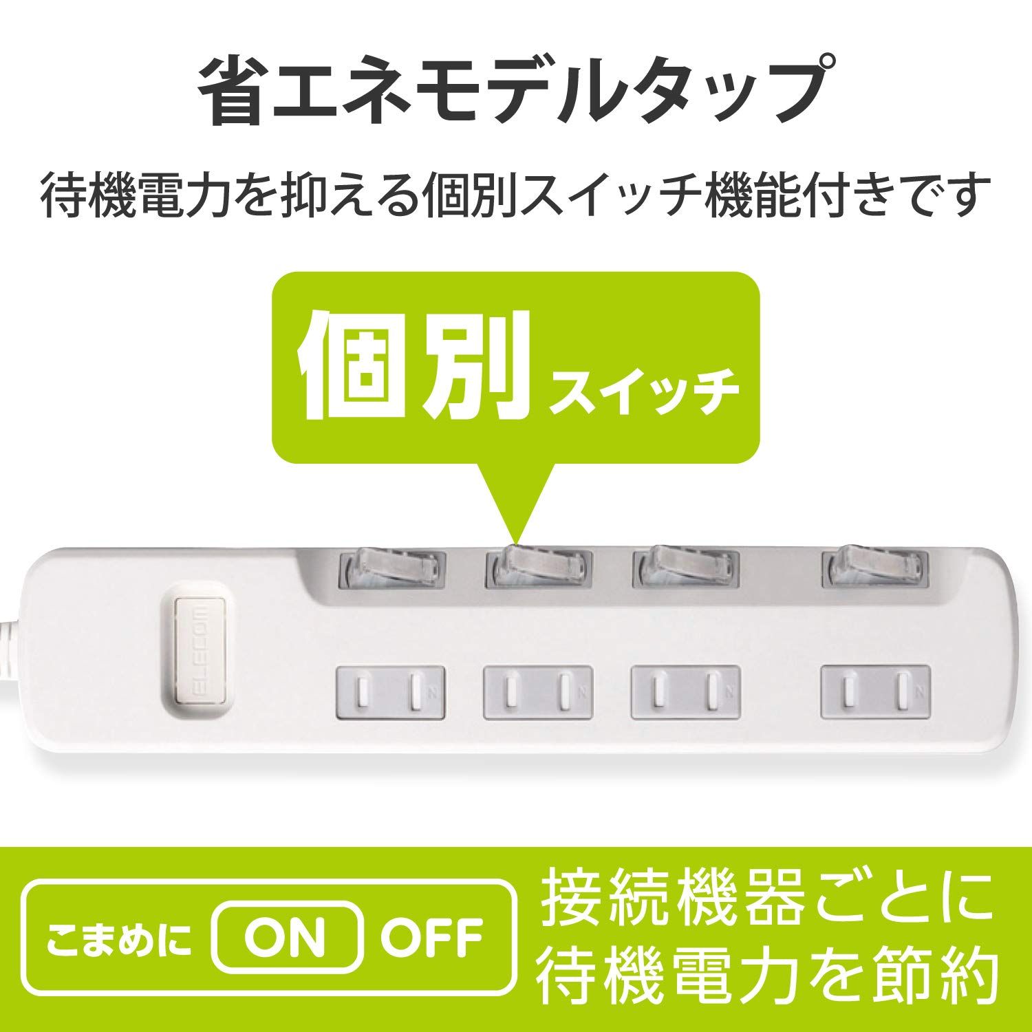 ■ 接続機器ごとにON/OFFでき、待機電力を個別に節約できる個別スイッチが付いた省エネタップです。