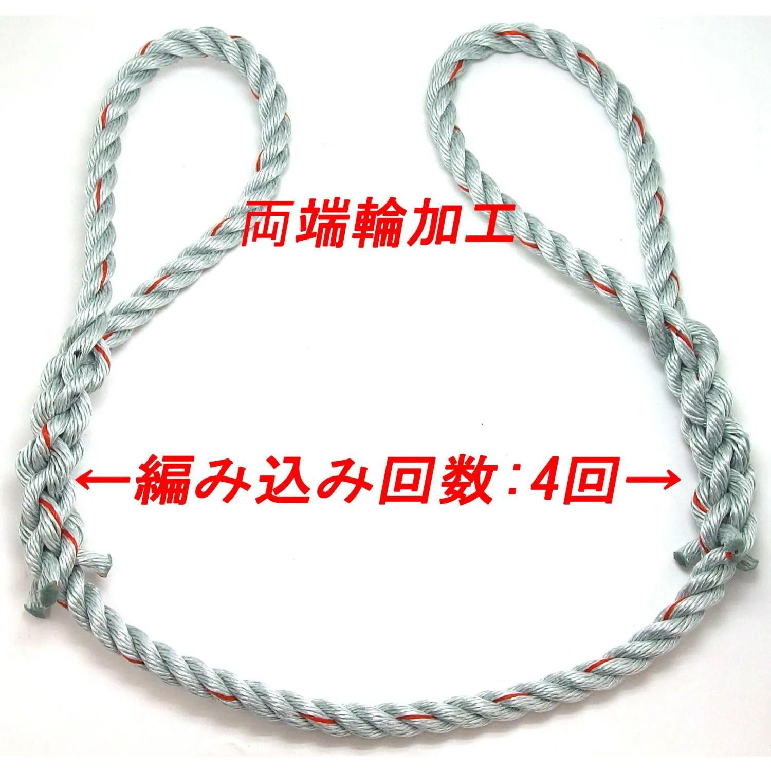 荷役作業をスムーズにするために、ロープ両端をサツマ加工(輪加工)しています。フックや荷物などに引っ掛けやすく、荷縛り・引張がスムーズです。