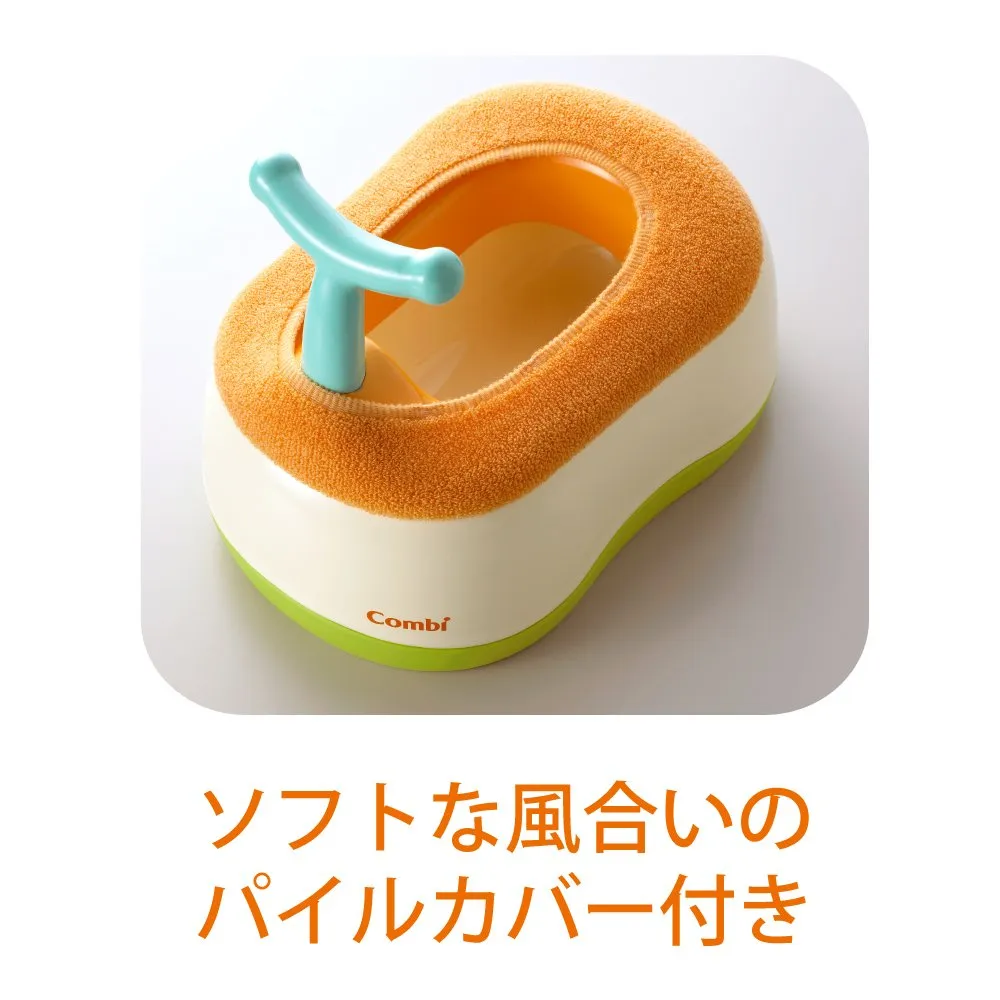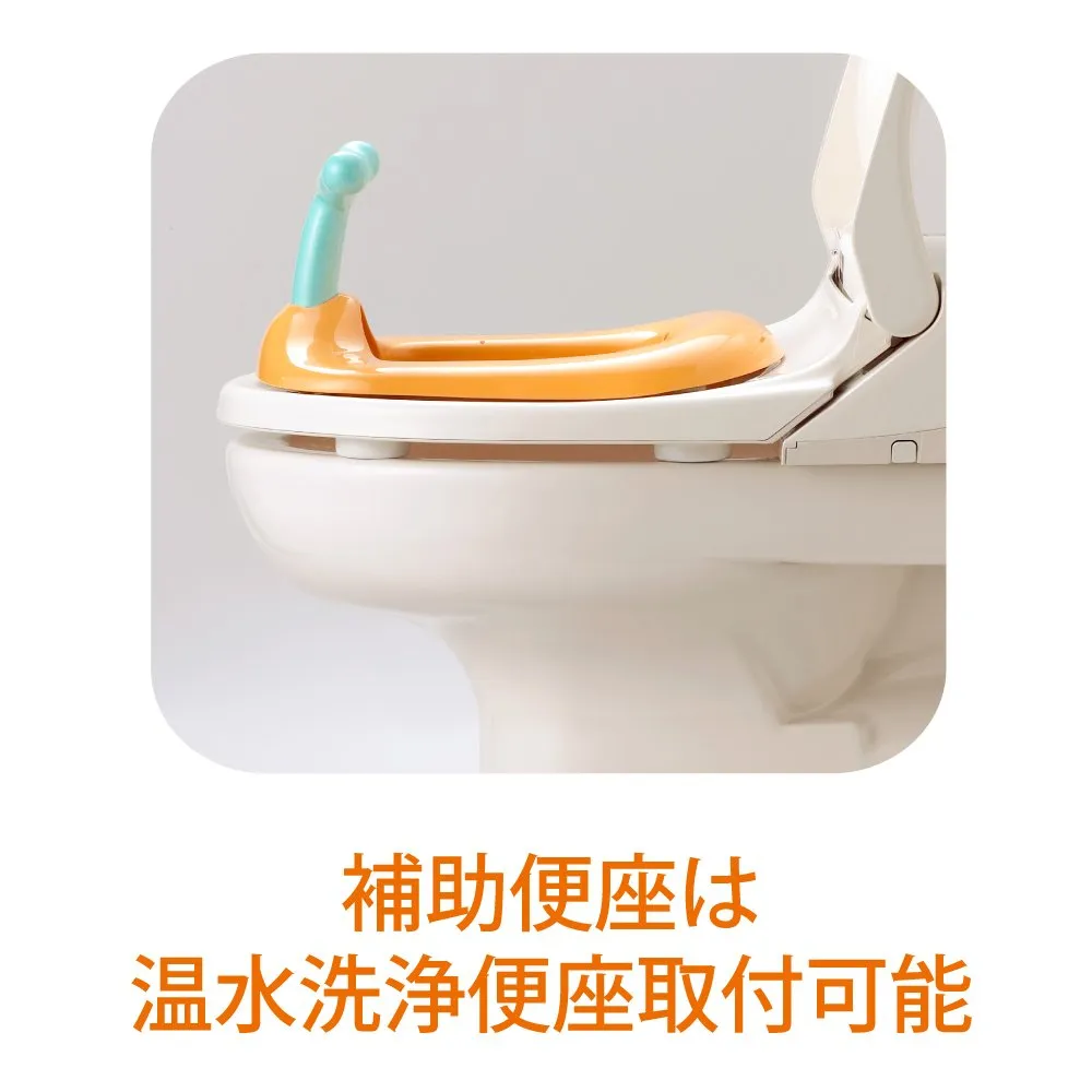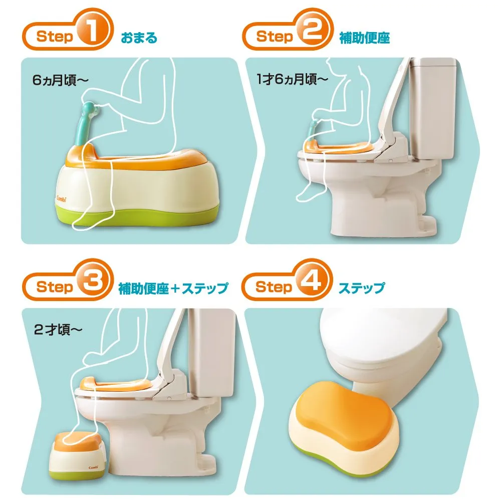 お子さまの成長に合わせ、最初は「おまる」、慣れてきたら「取っ手つきの補助便座」、仕上げは「取っ手なしの補助便座+ステップ」とステップアップしてトレーニングできます。