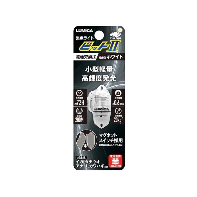 ルミカ(Lumica)集魚ライト ビットⅡ!!水中集魚ライト”ビット”が電池交換式にリニューアル!!マグネットスイッチ採用!開閉時の浸水トラブル防止!小型軽量。高精度発光。本体横に外部スイッチが設けられており、電源のオン・オフが出来ます。対象魚:イカ・タチウオ・アナゴ・カワハギ など