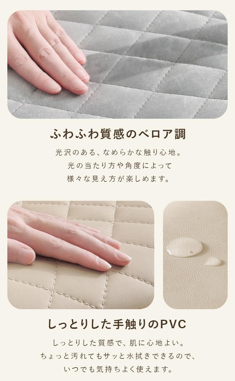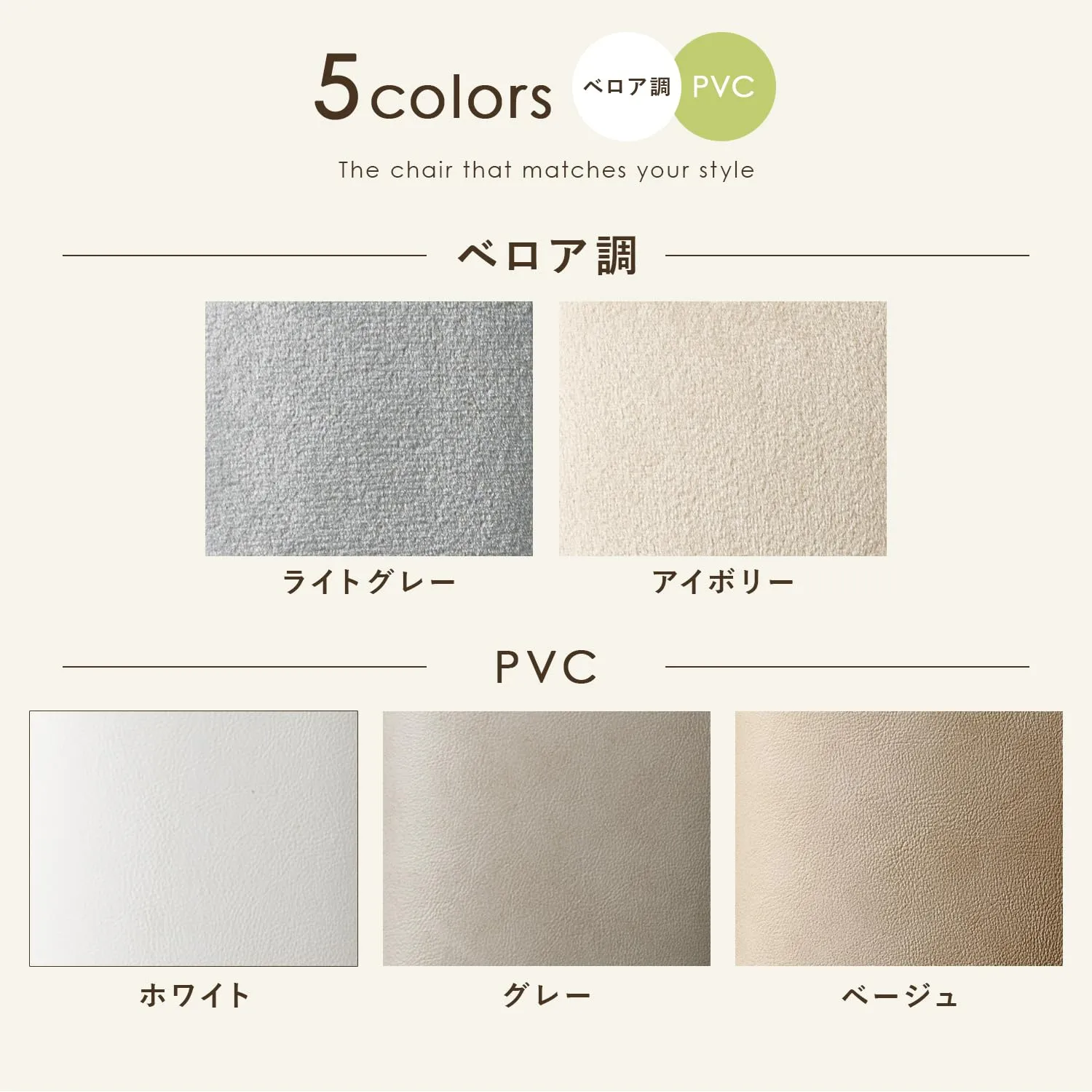 エレガントなベロア調の2色、リアルな本革風のPVC3色