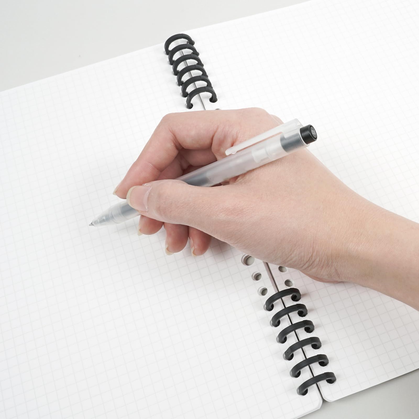 A4/30穴対応のリングですが、プラスチック製なのでハサミでお好みのサイズに切ることができ、B5/26穴、A5/20穴にしたり、6穴分だけリーフの両端を綴じ、リングが手に当たらず書きやすくすることもできます。