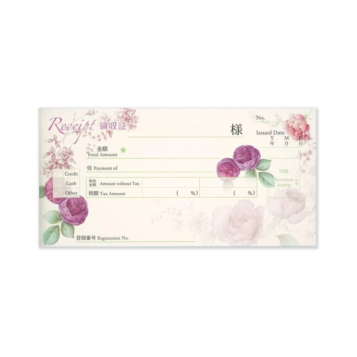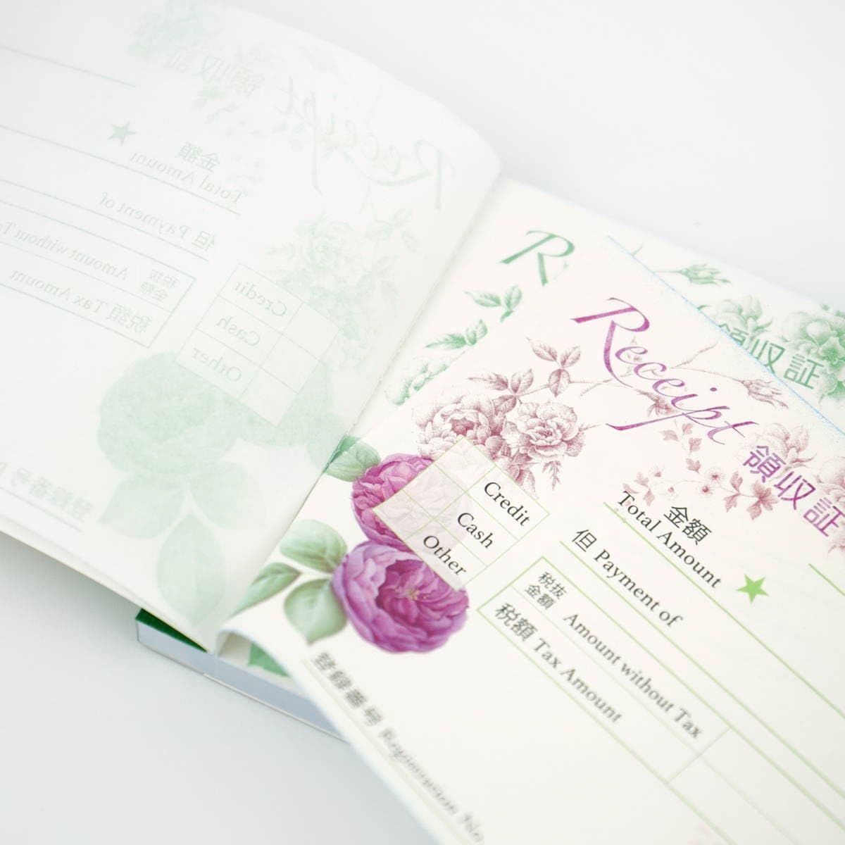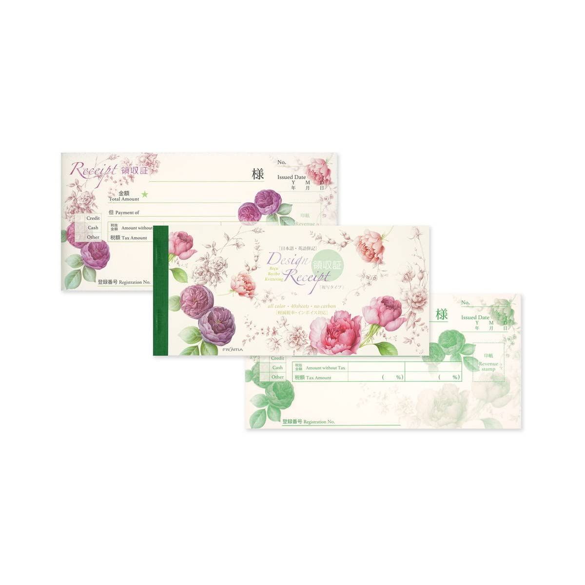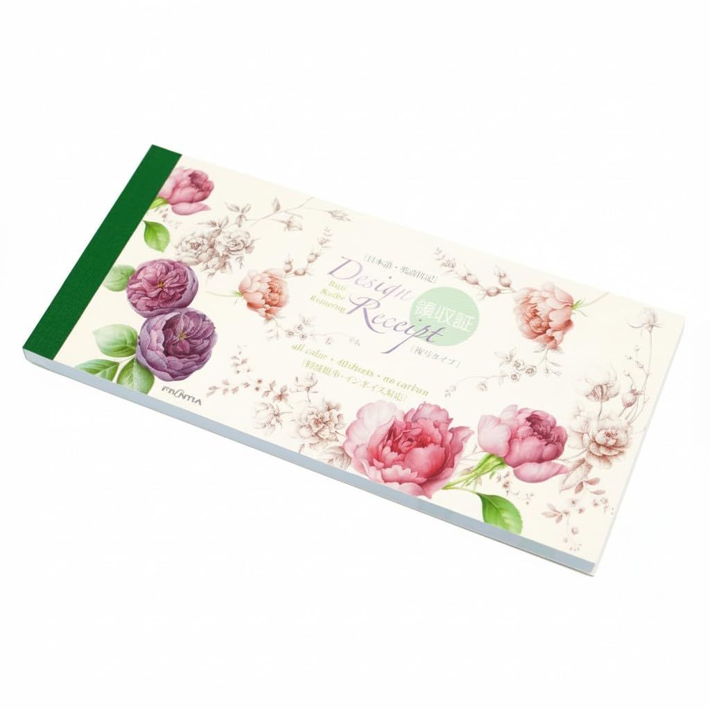 華やかに見えるおしゃれな領収書です。ノーカーボンで、2枚複写タイプ。ミシン目できれいに切り離せます。40シート。小切手サイズ。