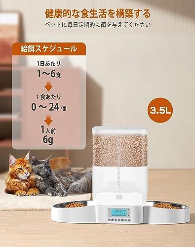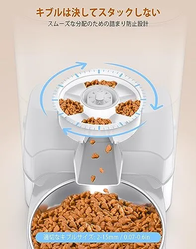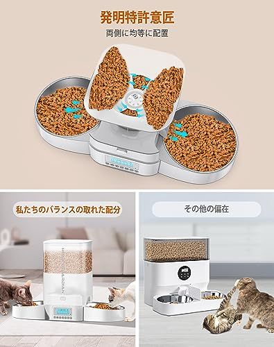 【両側で均等給餌、ペットのケンカ防止】5L 2匹用猫自動給餌器は高度な特許取得技術を採用しており、ペットフードの両側均等給餌を実現し、給餌分布の偏りを解消します。 左右の給餌設計により、ペットに静かな給餌環境を提供します。 ペットが食べ物をめぐって争う心配はもうありません。 複数のペットを飼っているご家族に最適です。