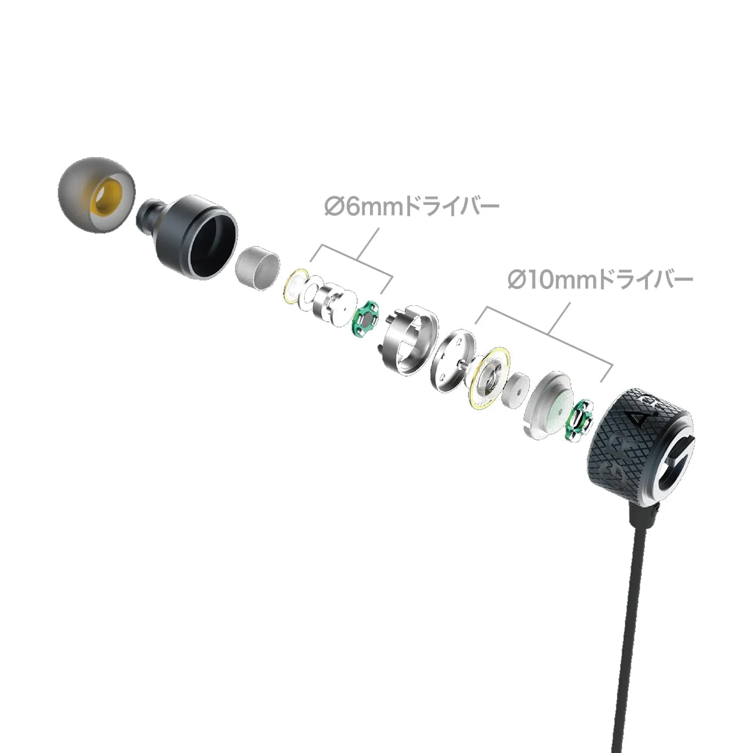【イヤホン部】:ドライバー:デュアルダイナミック ドライバーユニット: 6mm + 10mm 最大出力:10mWm インピーダンス:28Ω 音圧感度:105dB±3/mW 再生周波数帯域:10Hz ~ 40000 Hz プラグ : 3.5mm 金メッキ 4極L型ステレオプラグ ハウジング:アルミニウム切削 ケーブル長: 約2m 重量:10g(片方5g) ※ケーブル含まず