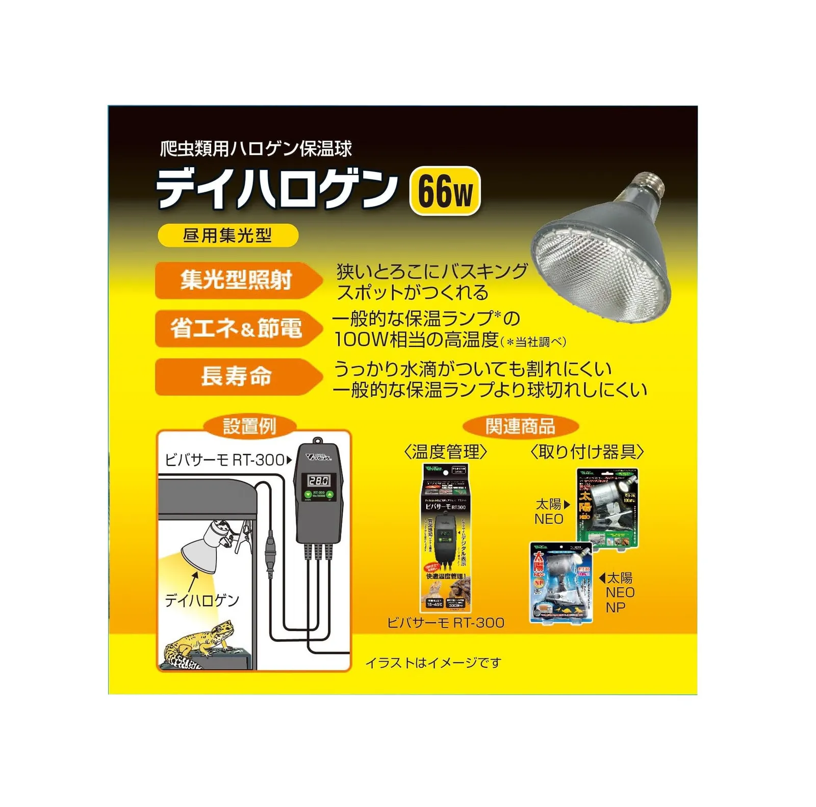 長寿命、割れにくくて球切れしにくい。省エネ&節電の66Wで一般的な保温ランプの100W相当の高温度。