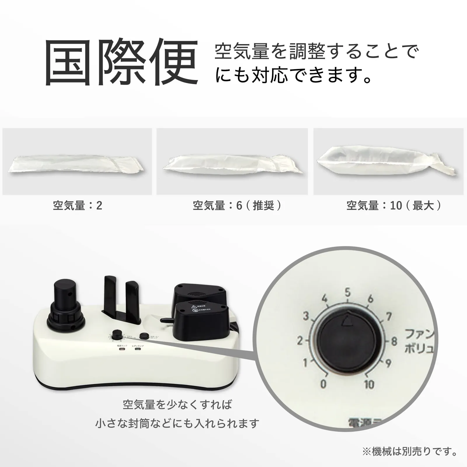 専用機ACM02、ACM03でエアーを封入してエアー緩衝材にすることができます。ご利用の際は別売りの専用ベース(ACMB100)が必要です。