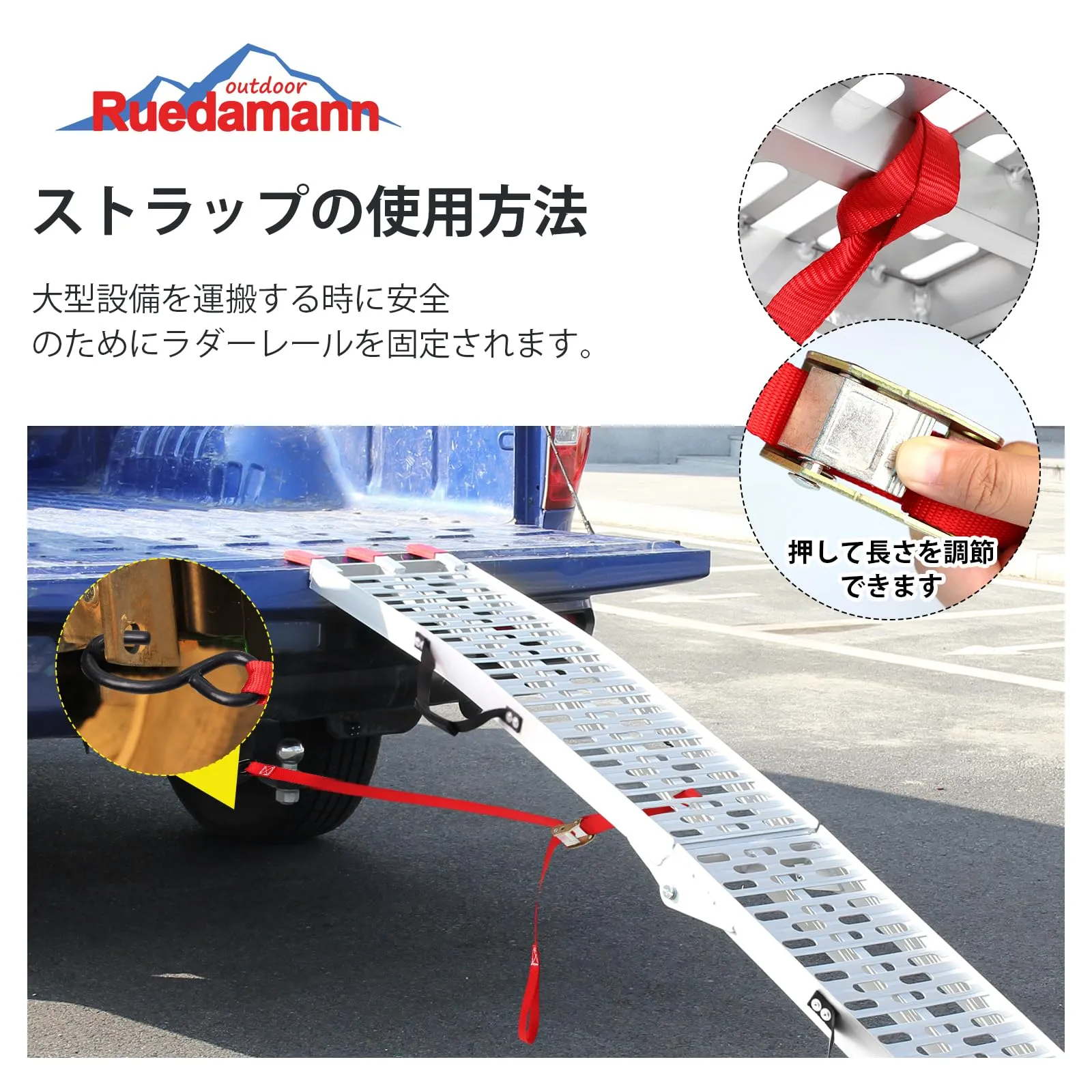 軽量丈夫:材質は軽量化アルミニウム合金で、軽量で高強度です。1本あたりの重量はわずか7.1kgですが、耐荷重は最大340kgあり、安定してご使用いただけます。アルミは強度が高くて、靭性と弾力性が強いので、使用はもっと安定です。また、本バイクラダーのヒンジ部分は一般的な製品より2.5cm長く設計されており、より頑丈で耐久性があります。