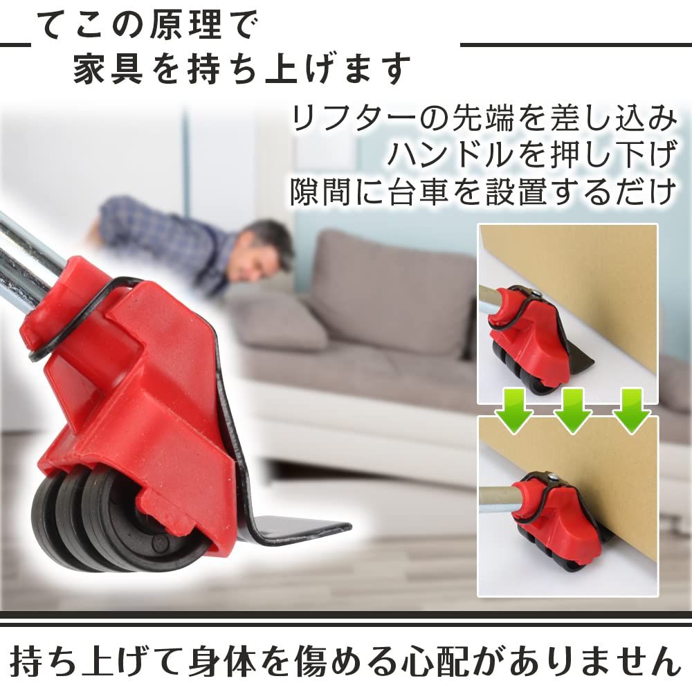 【操作方法】1.移動したい家具の下にリフターを差し込み、ハンドルをゆっくりと押し下げます。2.家具の下に隙間ができましたら、付属の台車を4隅に設置します。3.家具を押すことでスムーズに移動します。※フローリング床など平面な場所でご使用ください。