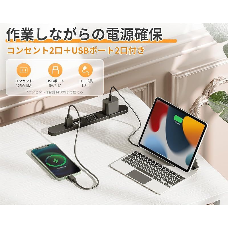 【コンセント付き、作業しながらの電源確保】コンセント2口(合計1450Wまで対応)+USBポート2口が付いております。席に座っているままで電源が取れ、ノートパソコンやスマホなどのチャージが超便利。電池残量を気にせずに長時間の作業が可能で、効率が大幅にアップ。