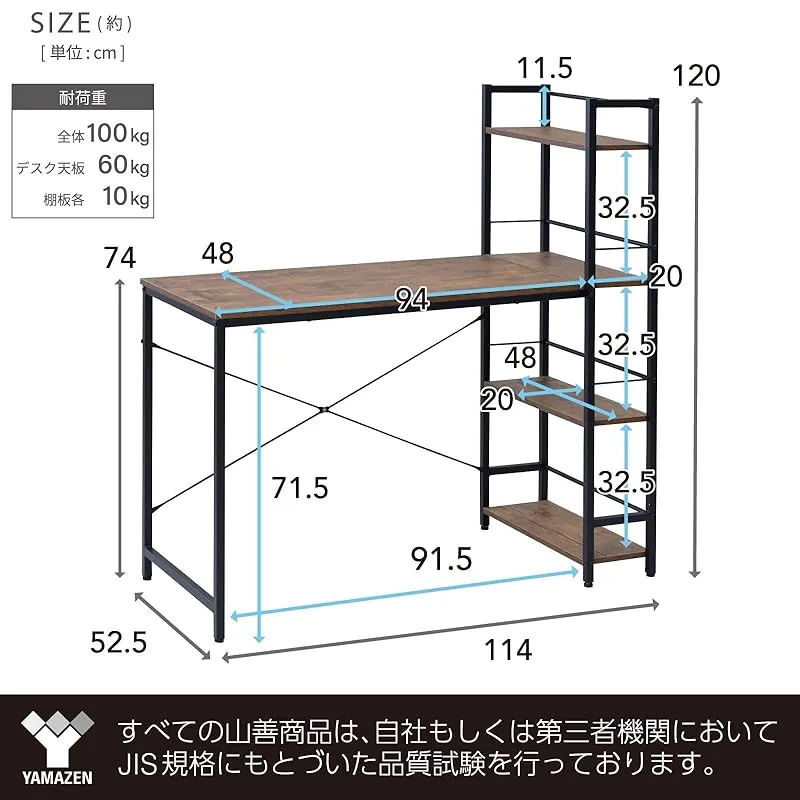 商品名:山善(YAMAZEN) デスク ラック付きデスク (棚は左右付け替え可) 机 棚付き パソコンデスク PCデスク 勉強机 A4対応 傷汚れに強い天板 幅114×奥行52.5×高さ120cm ワークデスク 省スペース 収納 アンティークブラウン/サンドブラック