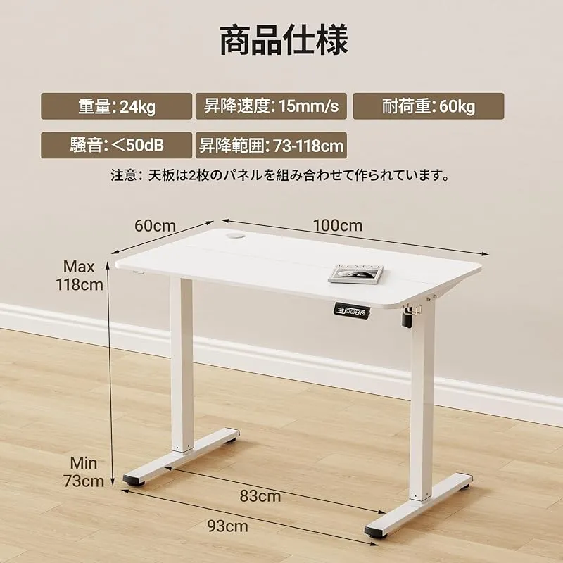 【商品仕様・全商品一年付き】天板サイズ 100* 60cm;高さ昇降範囲 73-118cm;天板厚さ 15mm;耐荷重 60kg;昇降速度 15mm/s;昇降音<50デシベル。Alebert全ての製品には1年間のメーカーが付いており、期間中には無償で交換や返金などのカスタマーサポートを提供しております。もしご組立中・ご使用中何かご質問などがございましたら、お気軽にお問合せ下さいませ。