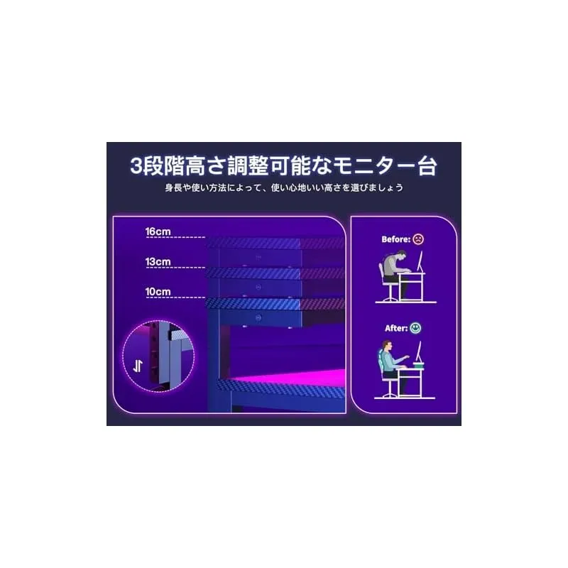 【一体化モニター台、高さ3段調整対応】身長や使い方法によって、高さは10cm、13cm、16cmの3種類からお選びいただける。背筋が伸びて自然と美しい姿勢に導き、首や肩への負担も軽くなり、長時間座ってもラクラク~下部の収納空間も作り出し、卓上の勤務スペースを解放し、デスクが広く使える。