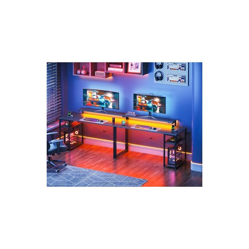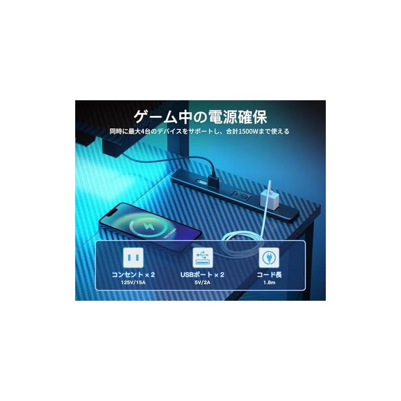 【コンセント付き、ゲーム中の電源確保】ゲーミング机にはコンセント2口+USBポート2口が付いている。同時に最大4台のデバイスをサポートし、合計1500Wまで使える。手近なところで電源が取れ、ゲーム機やコントローラーなどの充電が便利になり、電池残量を気にせずに長時間のゲームプレイを楽しむことができる。