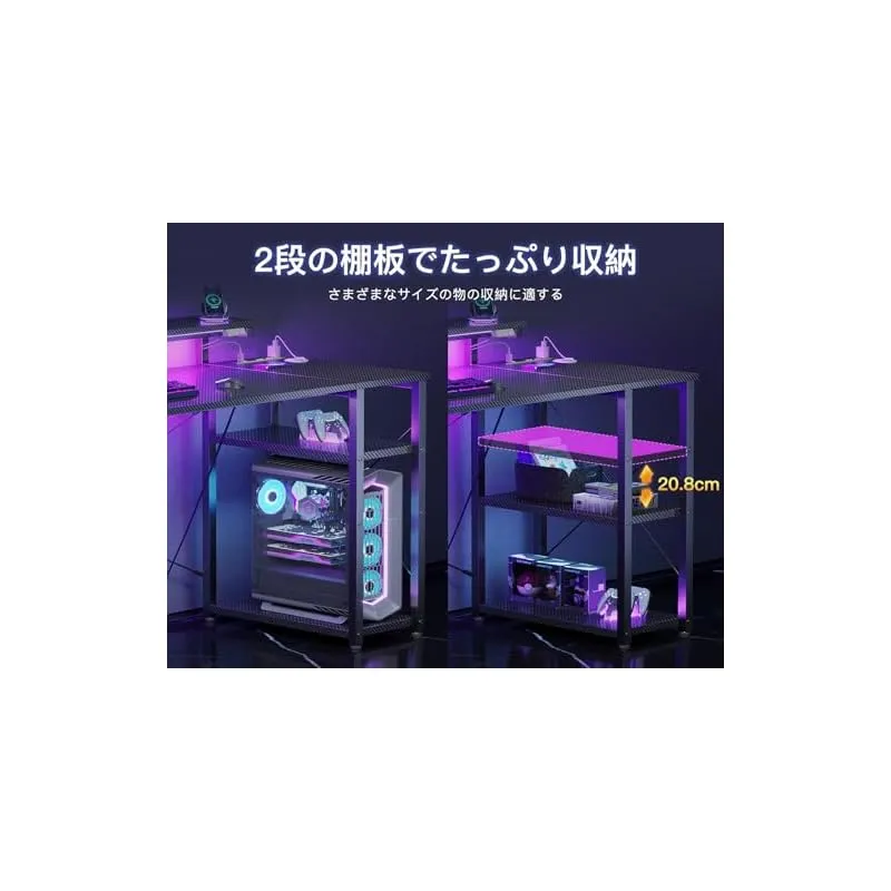 【収納力満載のラック、手の届く便利さ】ラックの部分は左右どちらにも設置OK。棚板が2段あり、置くものに合わせて上段の棚板の位置が調節可能。PCケースやゲーム機本体、ゲーム関連機材などがちゃんと片付けられる。席に座っているままで欲しいものがサッと手に入れる。限られたスペースで効率的な収納を実現している。