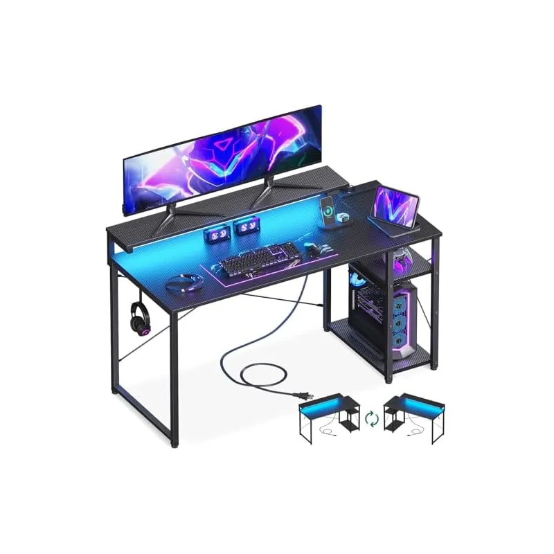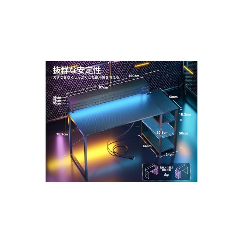 商品名:AODK ゲーミングデスク パソコンデスク ラック&コンセント付き 幅120cm 机 pcデスク ゲームデスク gaming desk モニター台&LED付き ゲーミングテーブル 左右入れ替え対応 カーボン調ブラック
