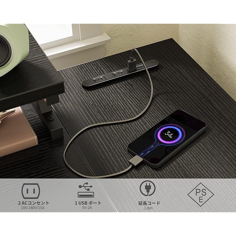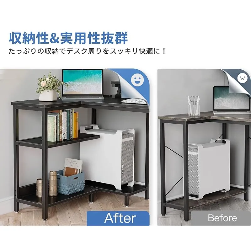【コンセント付きデスク】パソコンやスマホなどの充電ができて超便利です。デスクの足元には一体型のラックが備え、本や書類などを使いたい時にサッと取り出せます。また、L字型のデザインで部屋のコーナーを最大限に活用でき、ご家庭でもオフィスでも、日常の仕事に十分なスペースを確保できます。