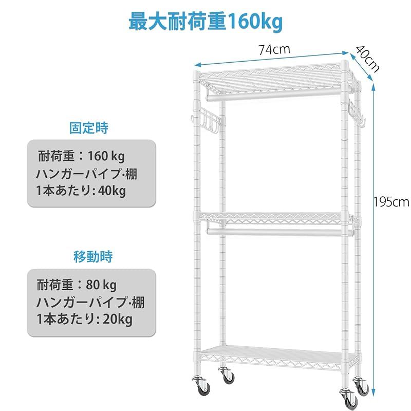 【ハンガーラック 商品サイズ】商品仕様:幅約74×奥行40×高さ195cm(アジャスター含む) ;洋服ラック本体重量(約):8.2kg;全体耐荷重(約):200kg;お客様組み立てが必要な商品です。ワードローブ豊富な収納スペースを備え、あらゆる種類の服を掛け、布団を収納可能。シンプル収納棚には下着、パンツ、日常の小物などを簡単に収納可能。下に靴下やポクッスなども収納可能。
