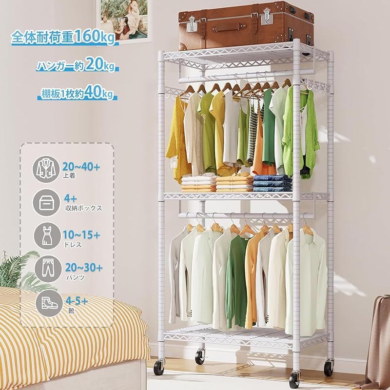 商品名:Hicrifth ハンガーラック 頑丈 洋服ラック 大容量 キャスター付き 棚付き 耐荷重200kg クローゼット ワードローブ 2段 洋服掛け 防サビ加工 組み立て簡単 高さ調節 省スペース おしゃれ ハンガーかけ コートハンガー 洋服収納 (幅74×奥行4
