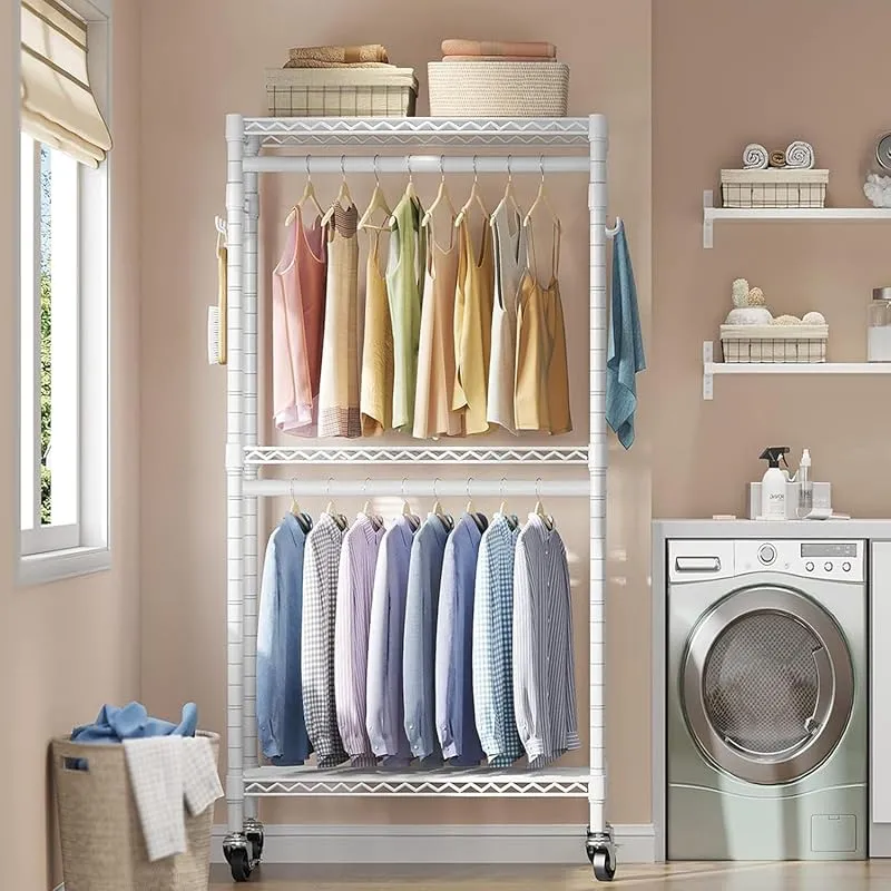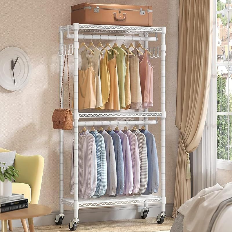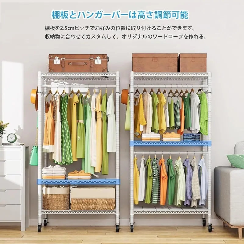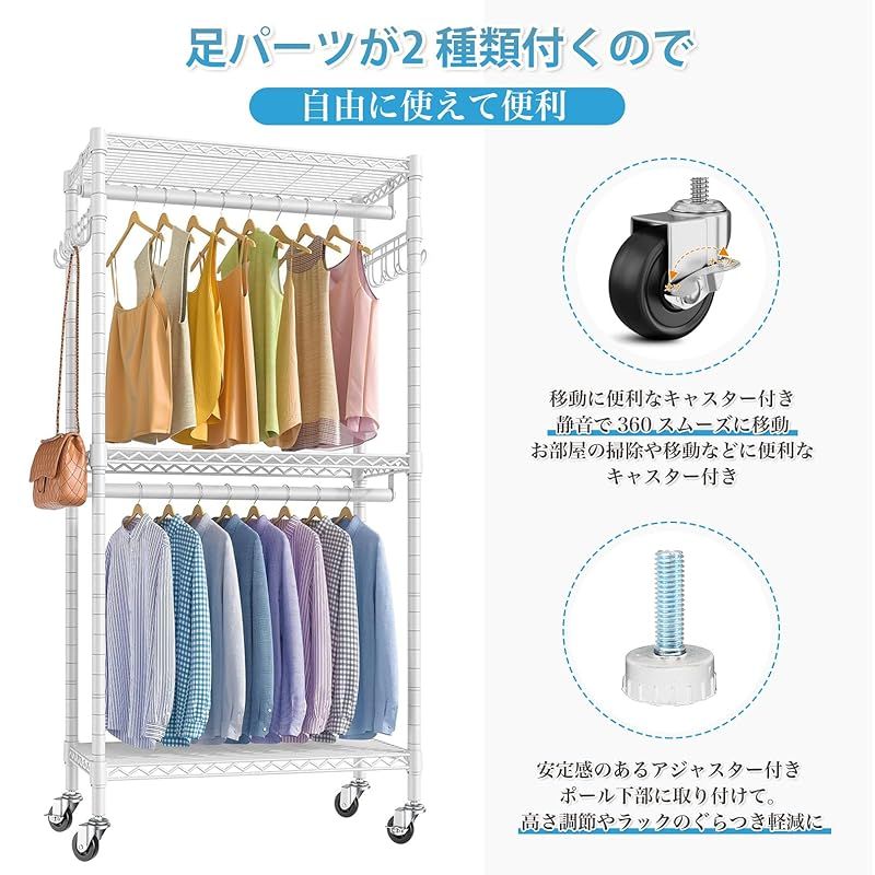 【ハンガーラック 頑丈】耐久性のあるスチールワイヤーとスリップ式のプラスチックスリーブ製、粉体塗装加工を施した、防錆性・耐熱性・耐油性に優れる頑丈なスチール製ポール、さらなる安定性を実現する、幅広のレベル調整足が付きます。こちらのはんがーらっくには、上部はフラットな天板で、収納箇所として活用することができます、 さらに、ほこりから衣類をまもります。 衣装ラックサイドのバーでフックが付いているので、さらに収納の幅が広がります。