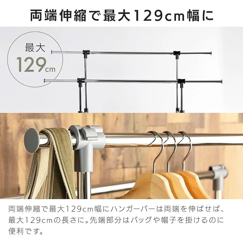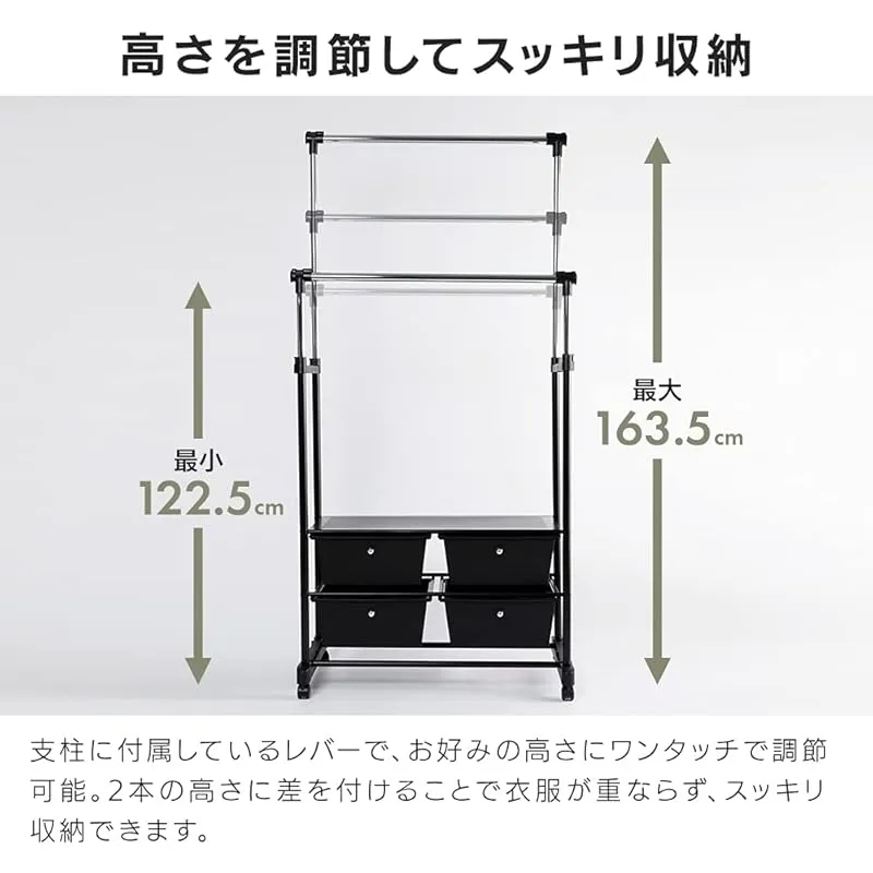 商品名:アイリスプラザ ハンガーラック ダブル 棚 収納ケース付き キャスター付き 高さ83~129 幅122.5~163.5 CHLK-8342 ブラック