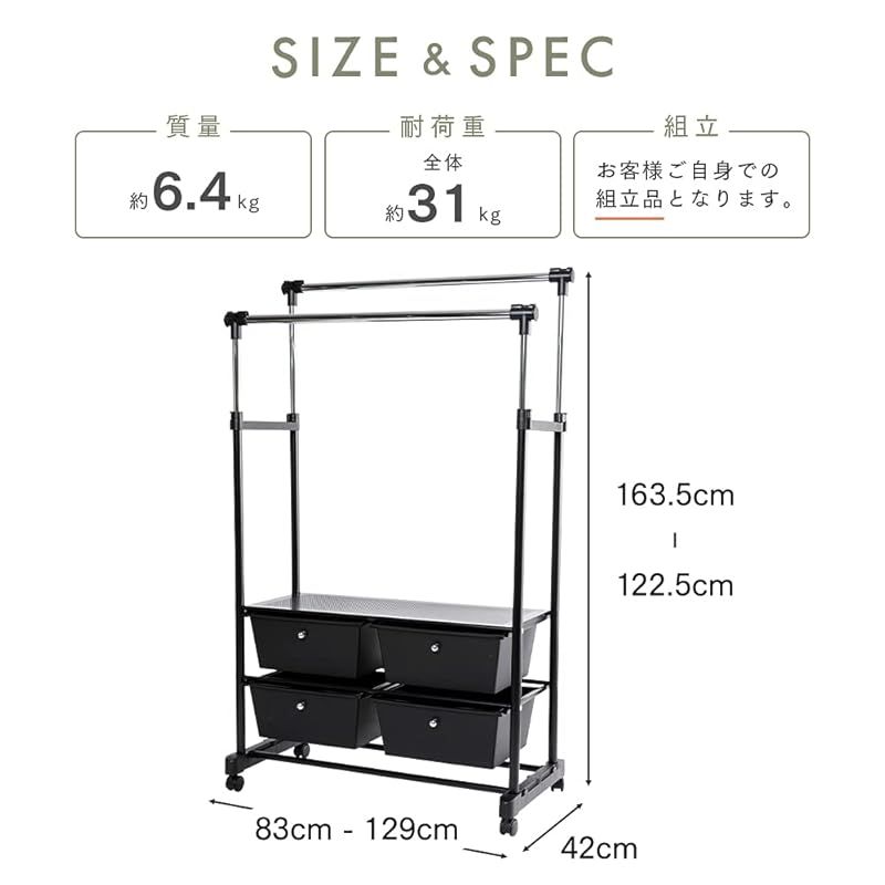 耐荷重:全体:約31kg [耐荷重詳細]伸縮棒(中心部):約7kg×2本、伸縮棒(端部):約1kg×4本、天板:約5kg、引き出し:約2kg×4個