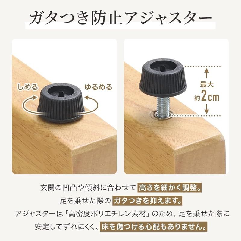 ?ガタつき防止アジャスターで玄関の凹凸や傾斜に合わせて高さを細かく調整できます。耐久性に優れた素材のアジャスターはずれにくく、床を傷つける心配がありません。