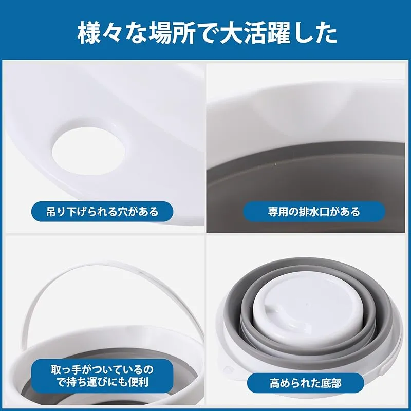 【多機能、多用途】:折りたたみバケツは、一つのバケツでさまざまな用途に使えるため、経済的です。釣り、キャンプ、アウトドア、スーツケースに入れて利用でき、洗車用バケツとしてもいいものです。キャンプで汲んだ水は、折りたたんで車のトランクに収納できます。防災用品、収納用品、釣りバケツ、園芸用バケツとしても、かなり活躍できます。