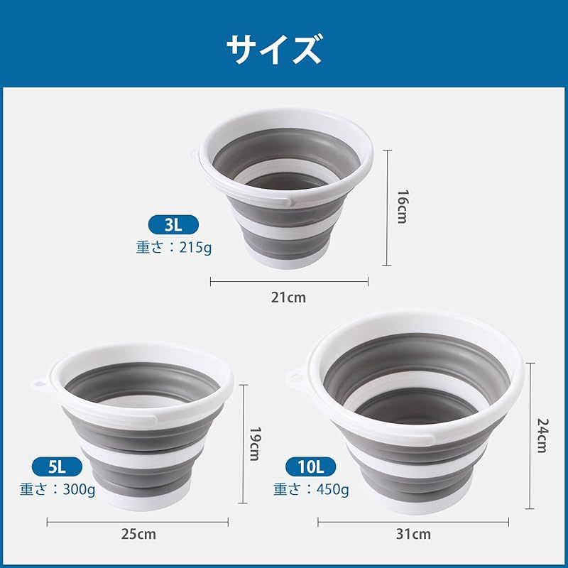 【基本仕様】:(1)3L:サイズ:折りたたみ時(約)長さ21×幅21×高さ3.5cm。 使用時(約)長さ21×幅21×高さ16cm。重さ(約)215g。容量(約)3リットル。(2)5L:サイズ:折りたたみ時(約)長さ25×幅25×高さ4cm。 使用時(約)長さ25×幅25×高さ19cm。重さ(約)300g。容量(約)5リットル。(3)10L:サイズ:折りたたみ時(約)長さ31×幅31×高さ5cm。 使用時(約)長さ31×幅31×高さ24cm。重さ(約)450g。容量(約)10リットル。材質:PP+TPR。