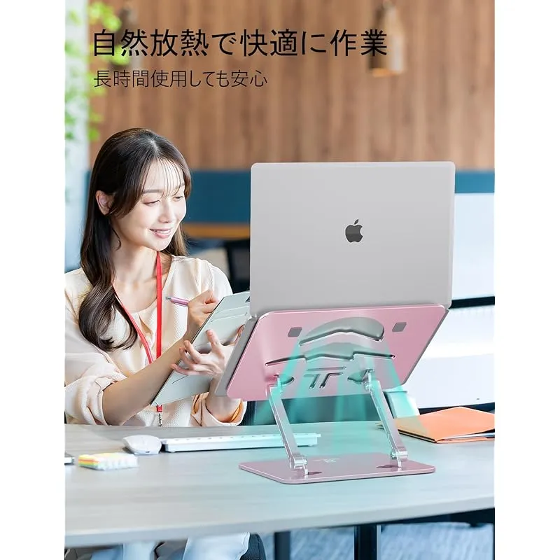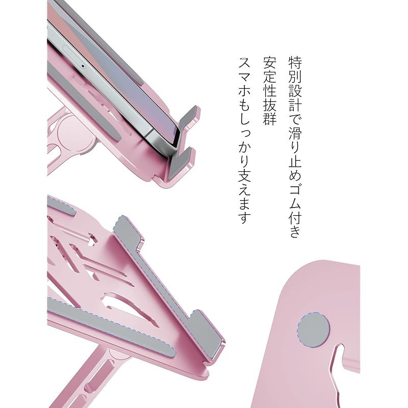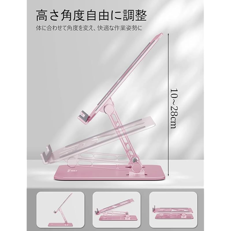 【優れた散熱効果&色とりどり】熱力学第二法則により、熱は自然に周りに逃げていきます。スタンドの裏面には大きな穴が開いており、デバイスの自然放熱を促進します。夏場や長時間の作業でも、安心してご使用いただけます。また、カラーバリエーションが豊富です。製品は10色からお選びいただけます。シンプルなシルバーブラックだけでなく、雀茶色やゴールド、女性向けのピンクや淡藤色、翡翠色などもあります。色に対する様々なニーズに応えます。