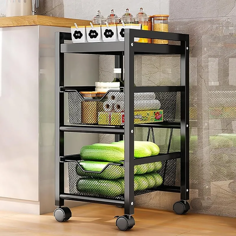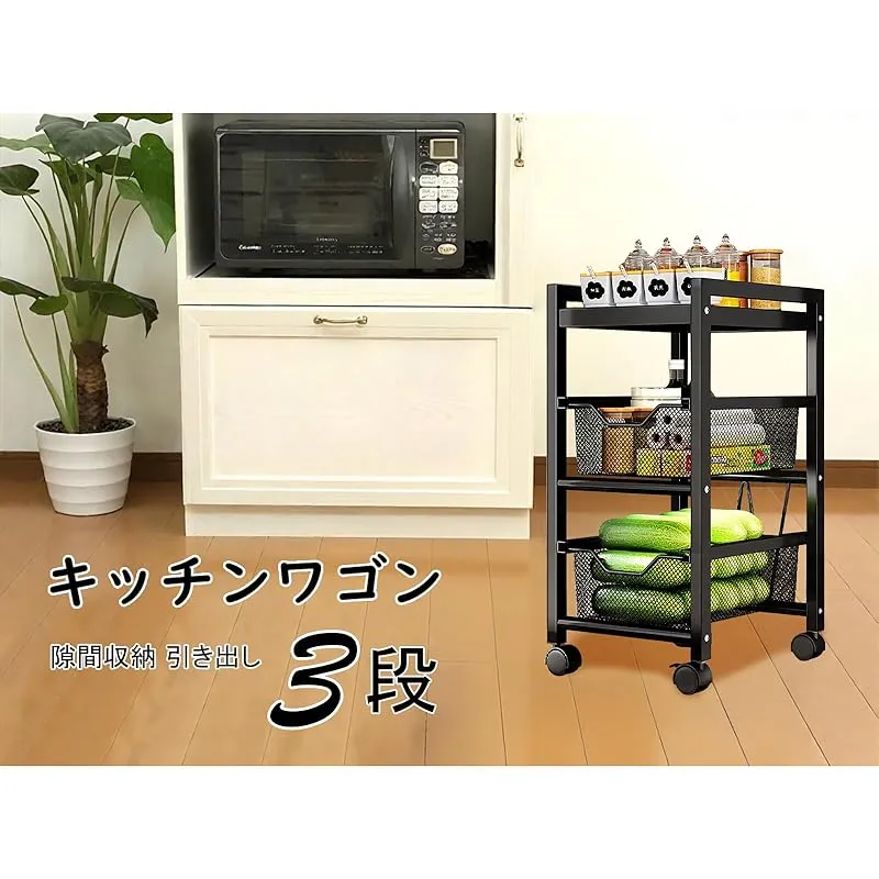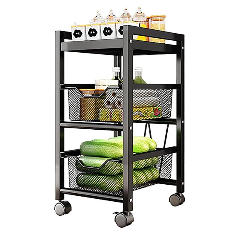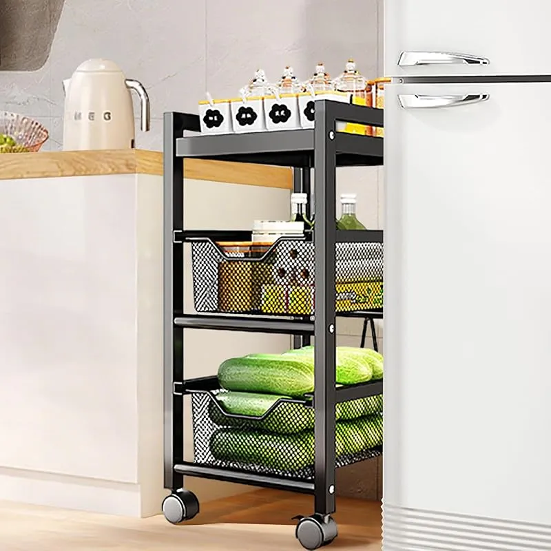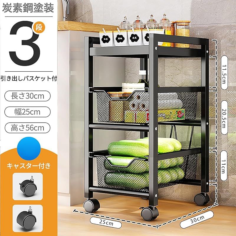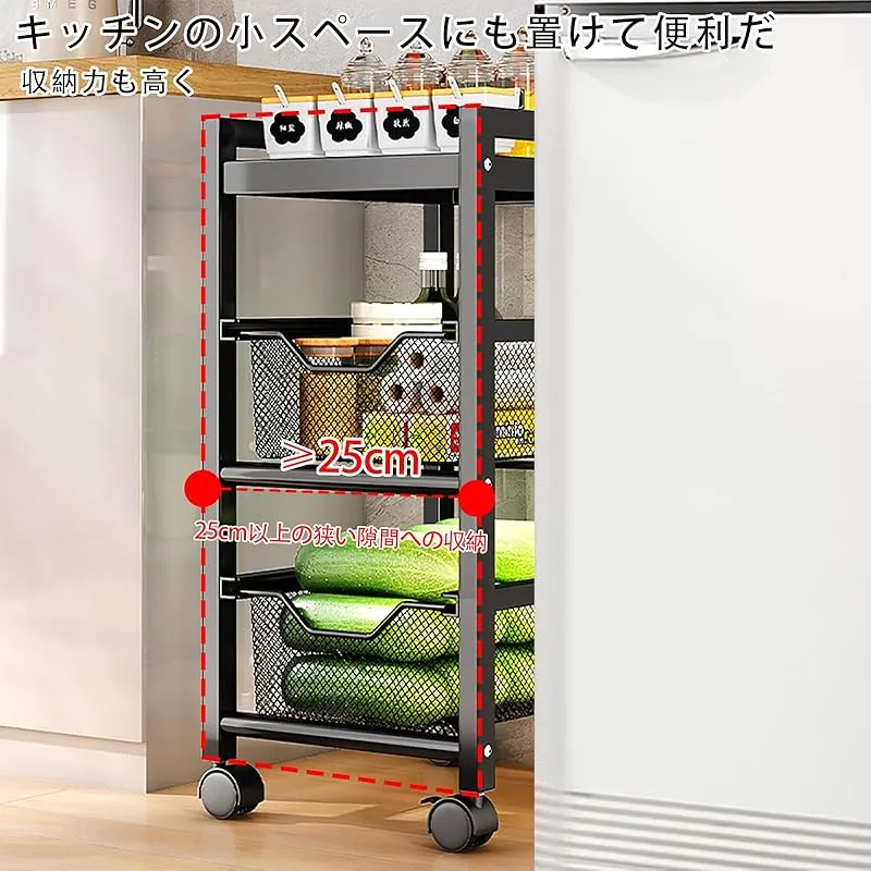 隙間の活用にピッタリ: キッチンワゴンは全体の幅はわずか25cmで、25cm以上の狭い隙間への収納に最適。引き出し式のスライド式収納バスケットを採用しており、狭いスペースでもスムーズにアイテムの出し入れが可能です。3段階の設計で、高さは56cm、各段約30cmの高さがあり、さまざまな高さのアイテムの収納ニーズに対応します。