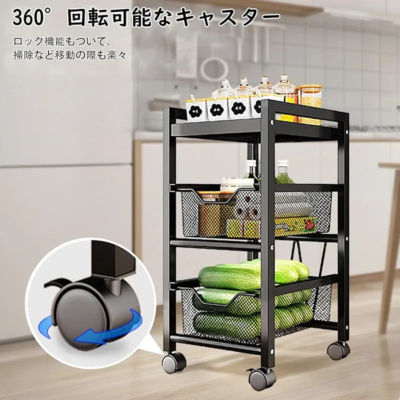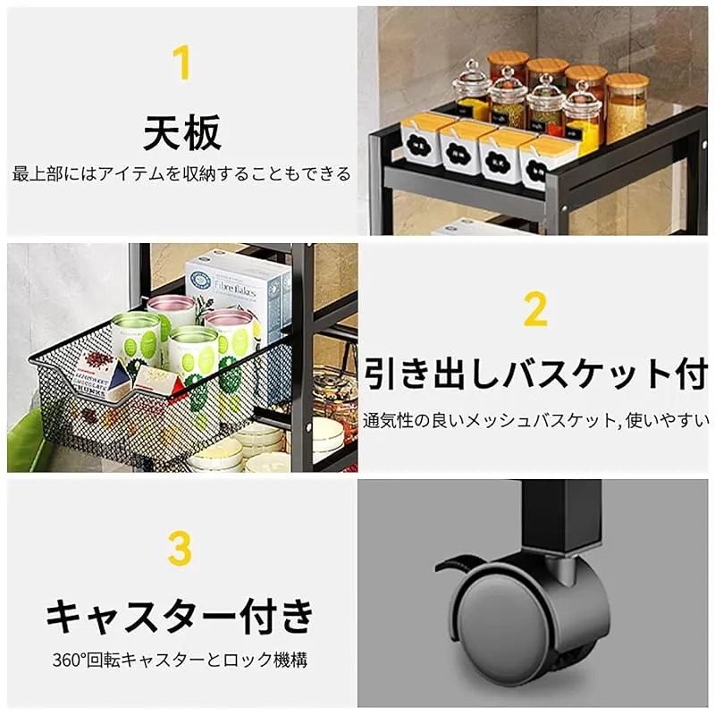 家庭収納用 スリムワゴン:バスケットラックとして、台所だけでなく、バスルーム、寝室、ドアと壁の隙間収納、洗濯機の横、冷蔵庫横、洗面所 、洗面台の横、リビングルームなど、家のあらゆる場所で活躍します。おもちゃやお菓子の整理だけでなく、個人のヘルスケア製品、小物、 食品、 調味料、装飾品、野菜、 果物、 食品、入浴剤、書籍など、幅広いアイテムを簡単に収納できます。暮らしのあらゆるシーンにおいて、整理整頓された空間を提供し、生活をより快適にします。