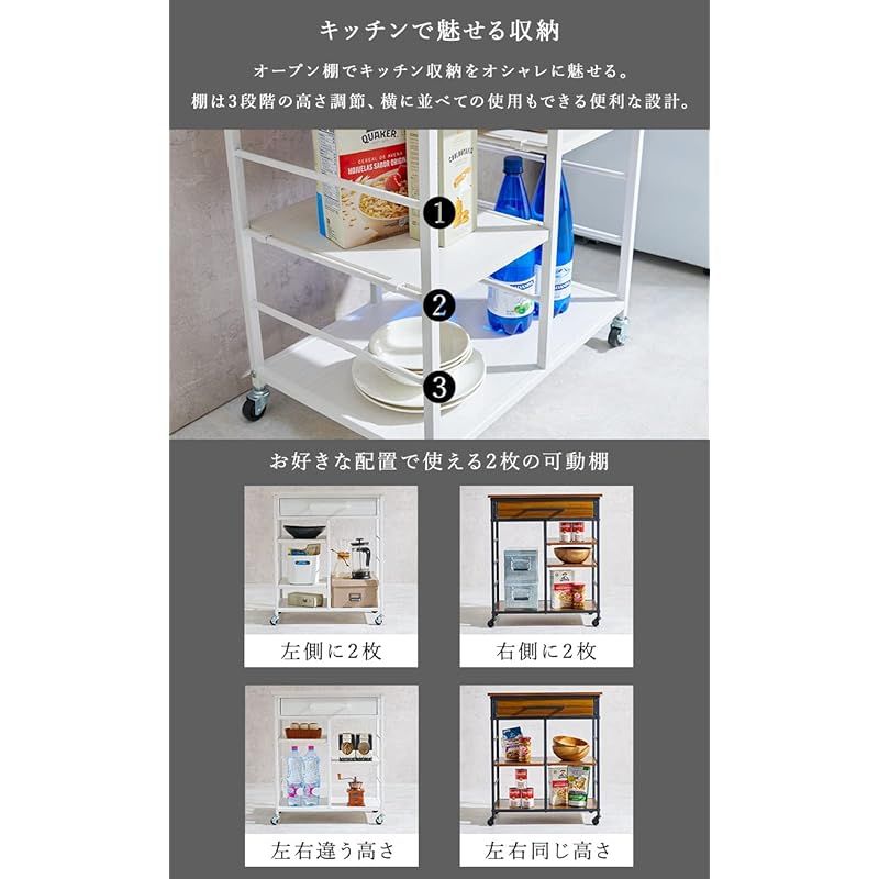 【引き出し付きで収納力アップ】引き出しはカトラリーなどの小物収納にぴったり。可動棚が1枚ついているので棚の高さは収納したいものに合わせて調節できます。フレームはマグネット収納やふきん掛けとしても活用できます。