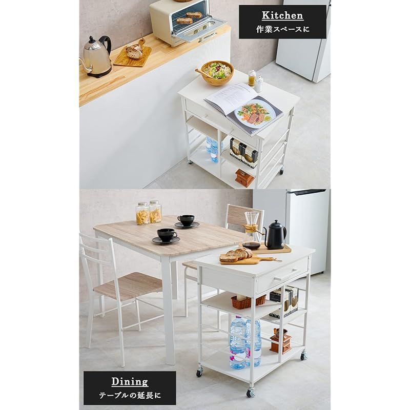 【あると便利なワゴンラック】:シンプルで使い勝手の良いキッチンワゴン。天板はお料理中の作業スペースだけでなくレシピやキッチン家電を置いたり、お菓子作りの作業台、コーヒーコーナーにも。キッチンの様々な場面で使うことができます。