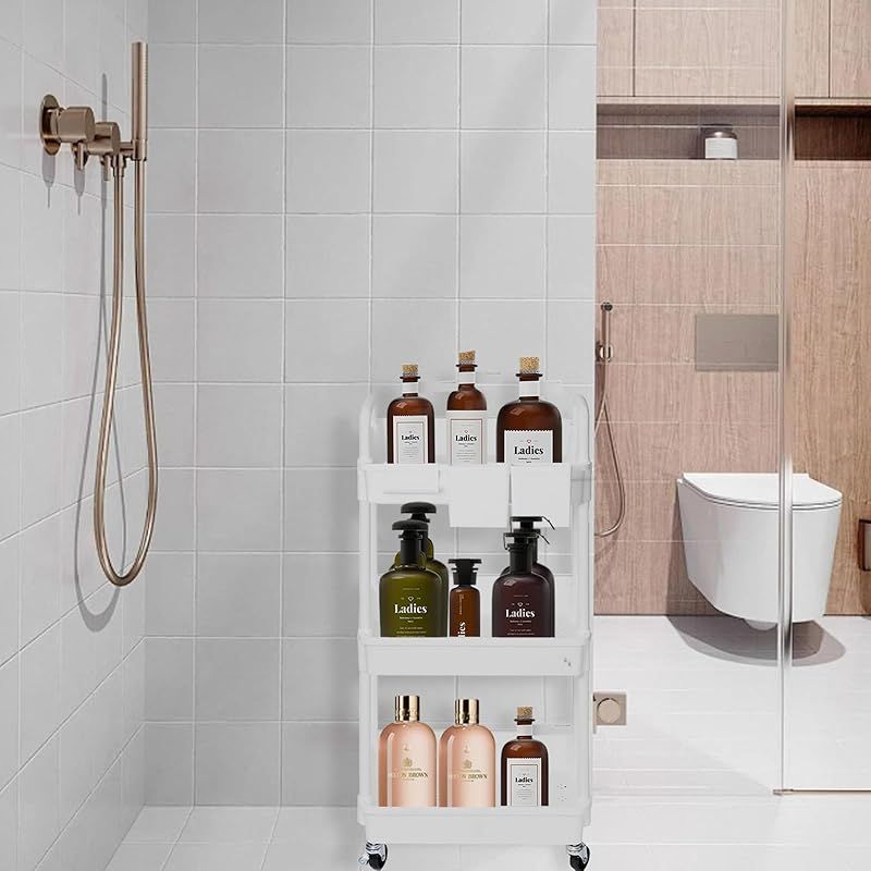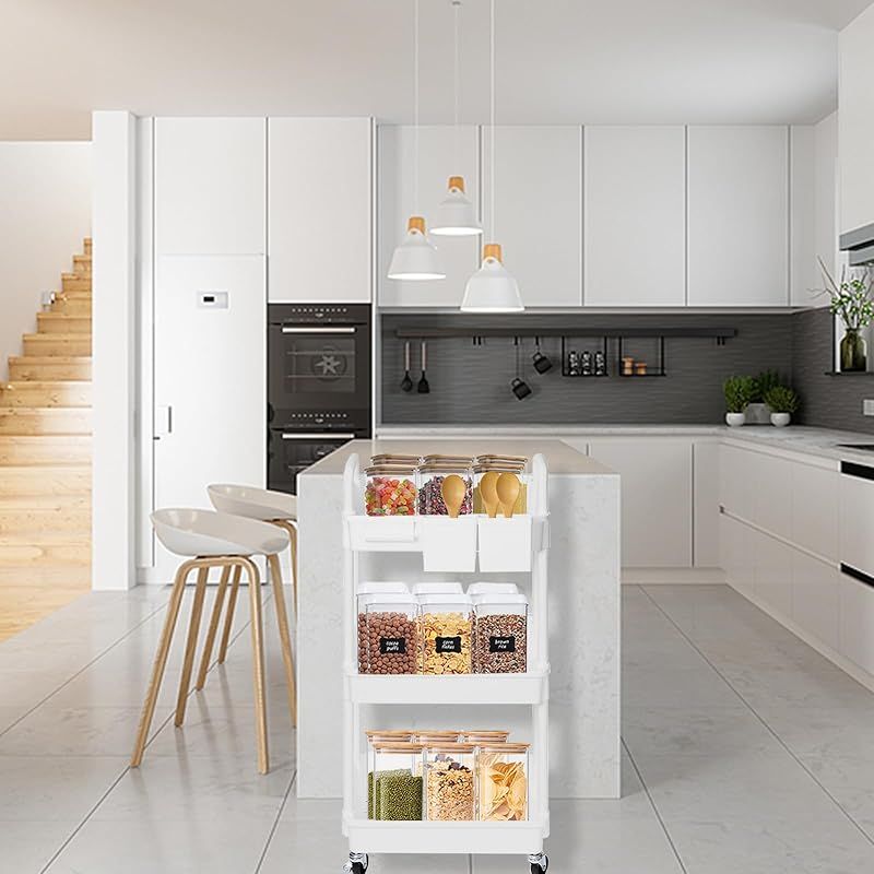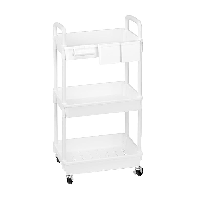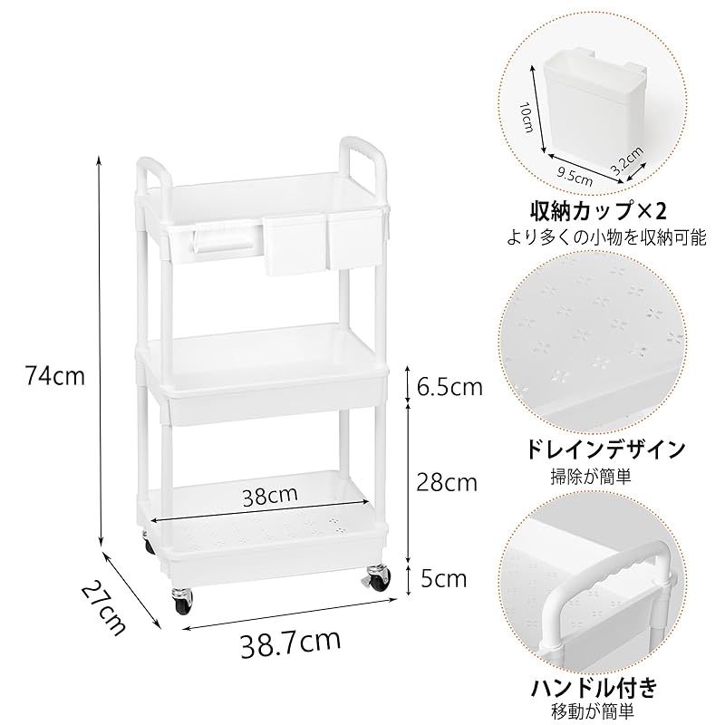 商品名:SIUSA キッチンワゴン ワゴン キャスター付き 3段 スリム 収納ワゴン 大容量 収納カート ハンドル/収納カップ付き ペットボトル収納 洗面所 台所 トイレ 浴室 冷蔵庫横 組立簡単 幅38×奥行27×高さ74cm ホワイト