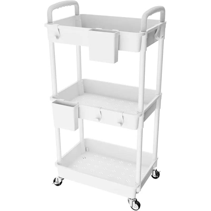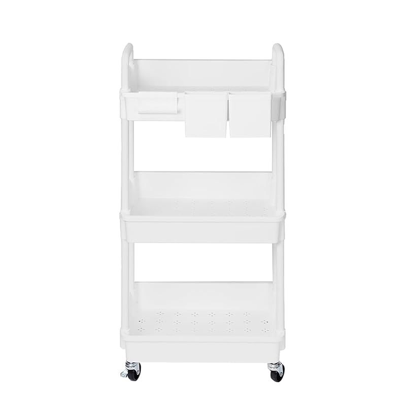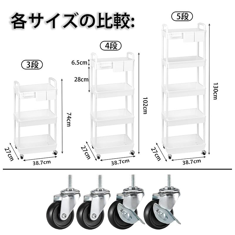 【大容量多機能キッチンワゴン】製品サイズ:38*27*74cm、特大サイズの高品質プラスチック製キャスター付きワゴンは、多くのモノを収納することができ、2つの収納カップと4つのフックが付属しており、収納力はさらに強化されています。キッチン、バスルーム、オフィス、子供部屋、寝室などに使用できます。