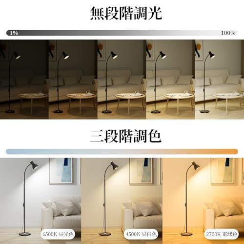 【無段階調光・調色&柔軟なネック】このフロアライトは2700K-6500K色温度と10%-100%の明るさが調節可能で、お気に入りの光を設定できます。また、ライトの最上は360回転可能により、お好みな角度が自由に調整でき、照らしたい所に明かりが届き、全方向照明を実現します。