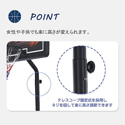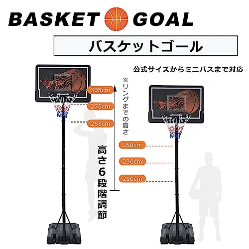 【幅広い高さ調節可能】210から305cmまで6段階調節可能で、ミニバスから公式試合まで幅広い高さを調節可能です。調節方法は簡単で、女性でも楽々に調節できます