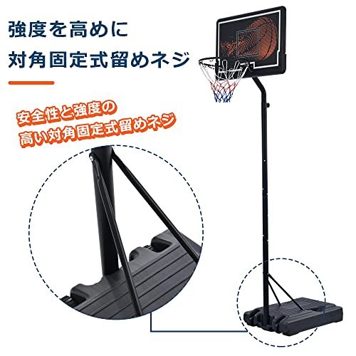 【オリジナルデザインのバックボード採用】ブラックオレンジのカラーを採用、バスケットボールの画像が注目します。 ボード素材には高密度ポリエチレンを使用し耐久性も安心です。 少し前傾したデザインは、ダンクシュートの時も邪魔になりません