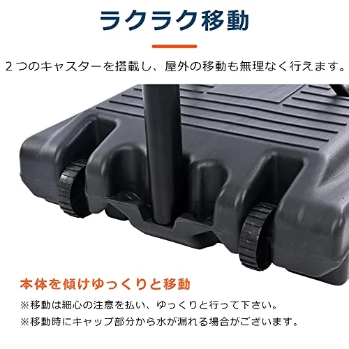 【移動スムーズキャスター付】2つのキャスターを搭載し、屋外の移動も無理なく行えます。本体を傾けゆっくりと移動移動は細心の注意を払い、ゆっくりと行って下さい。※移動時にキャップ部分から水が漏れる場合がございます